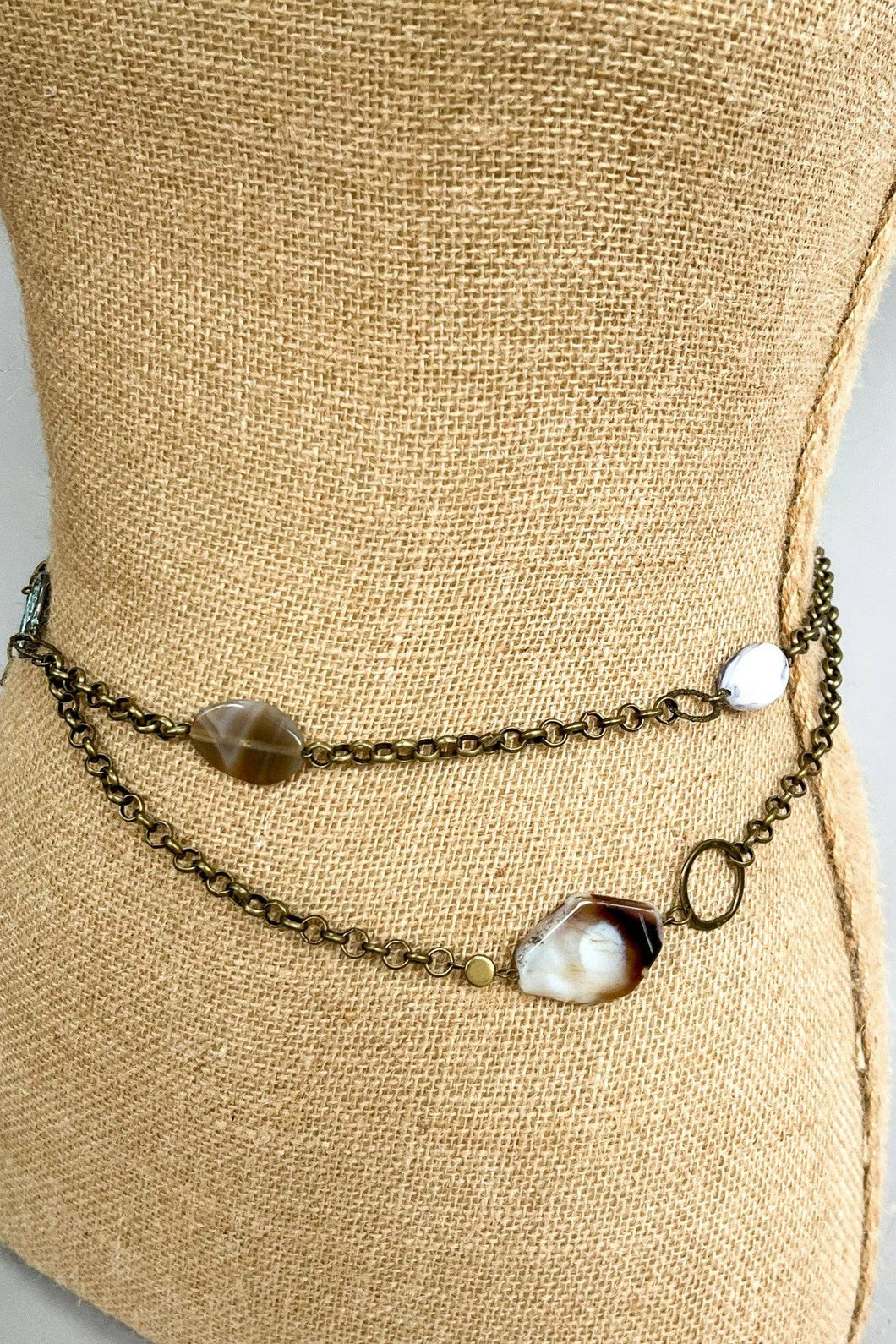 Bronze chain belt with Chinese coins and stone beads. Has a double layer look. 43"