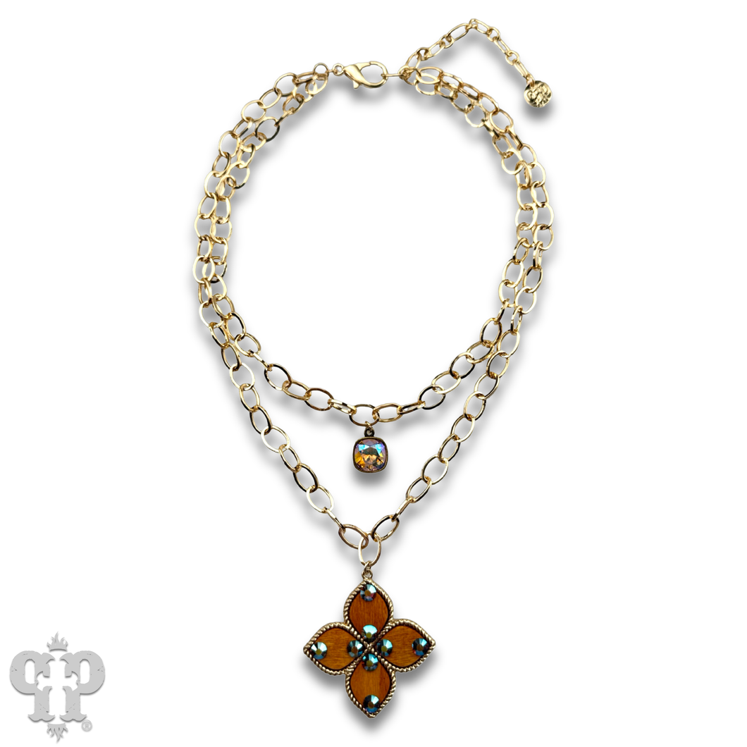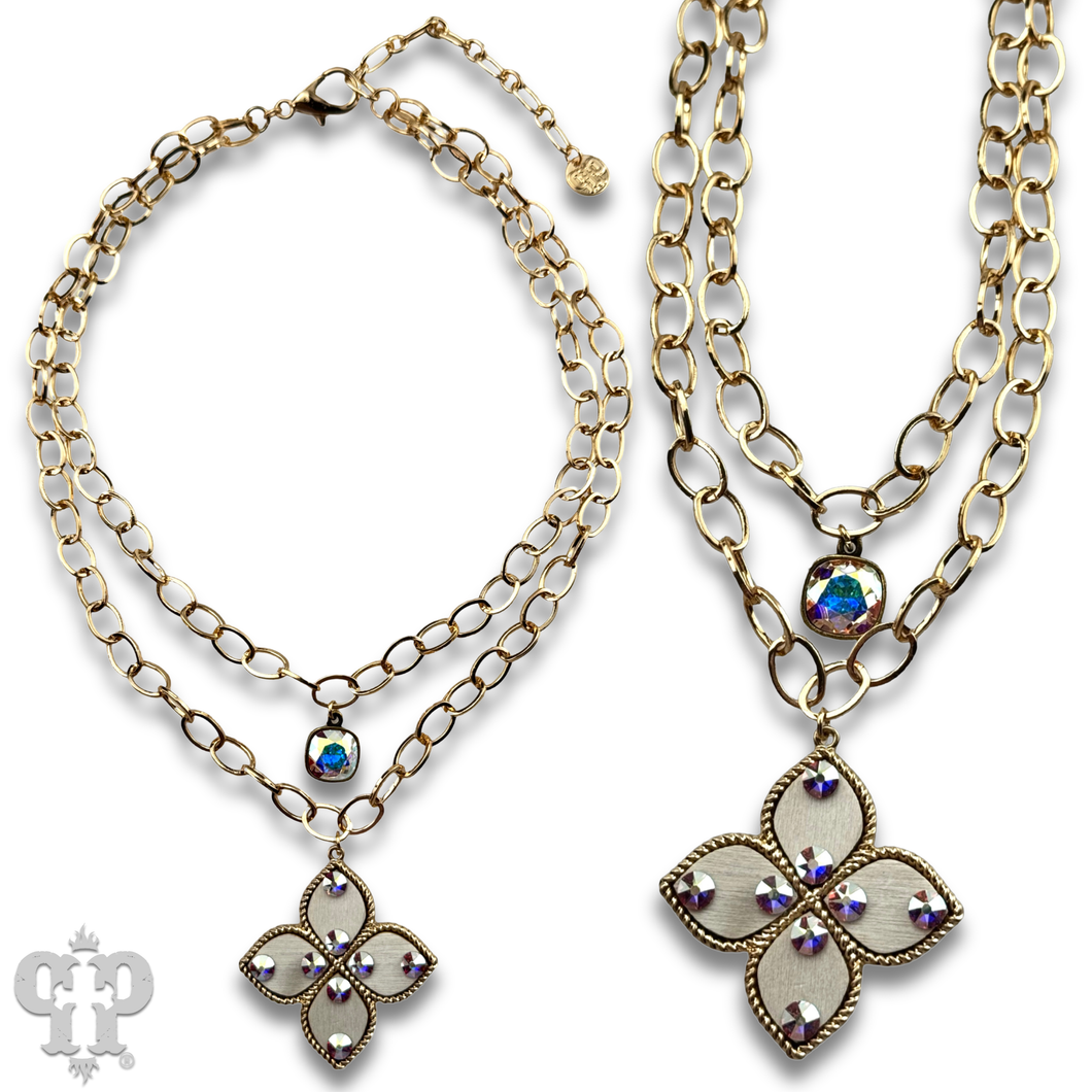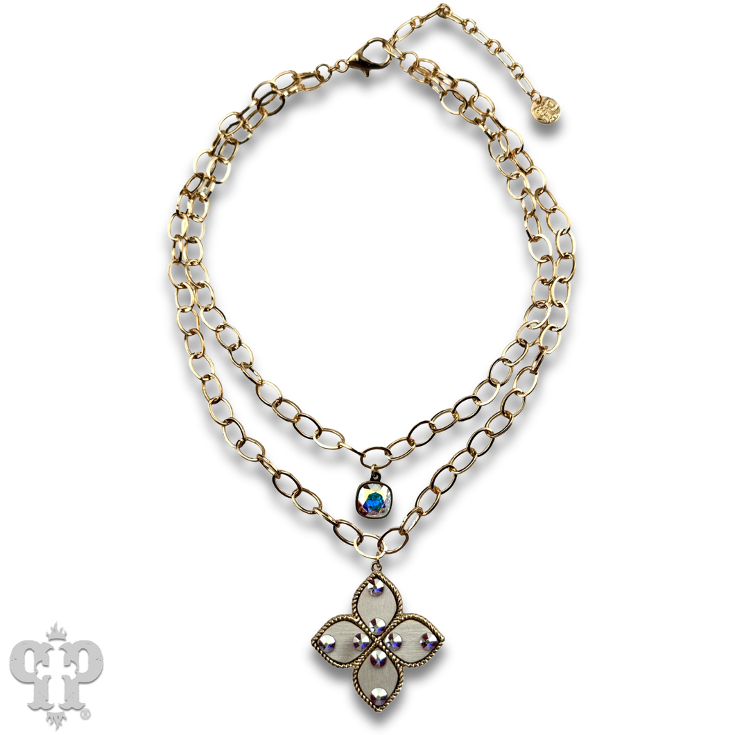 This necklace two rows of gold tone oval link chain. The longer strand has a four point clover charm with handset Austrian crystals. The shorter strand has an Austrian crystal drop in a setting custom made for Pink Panache in the USA.