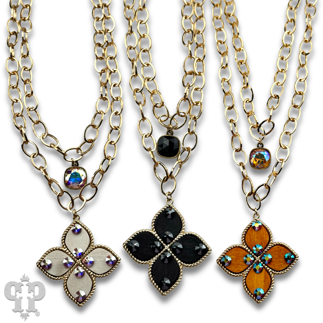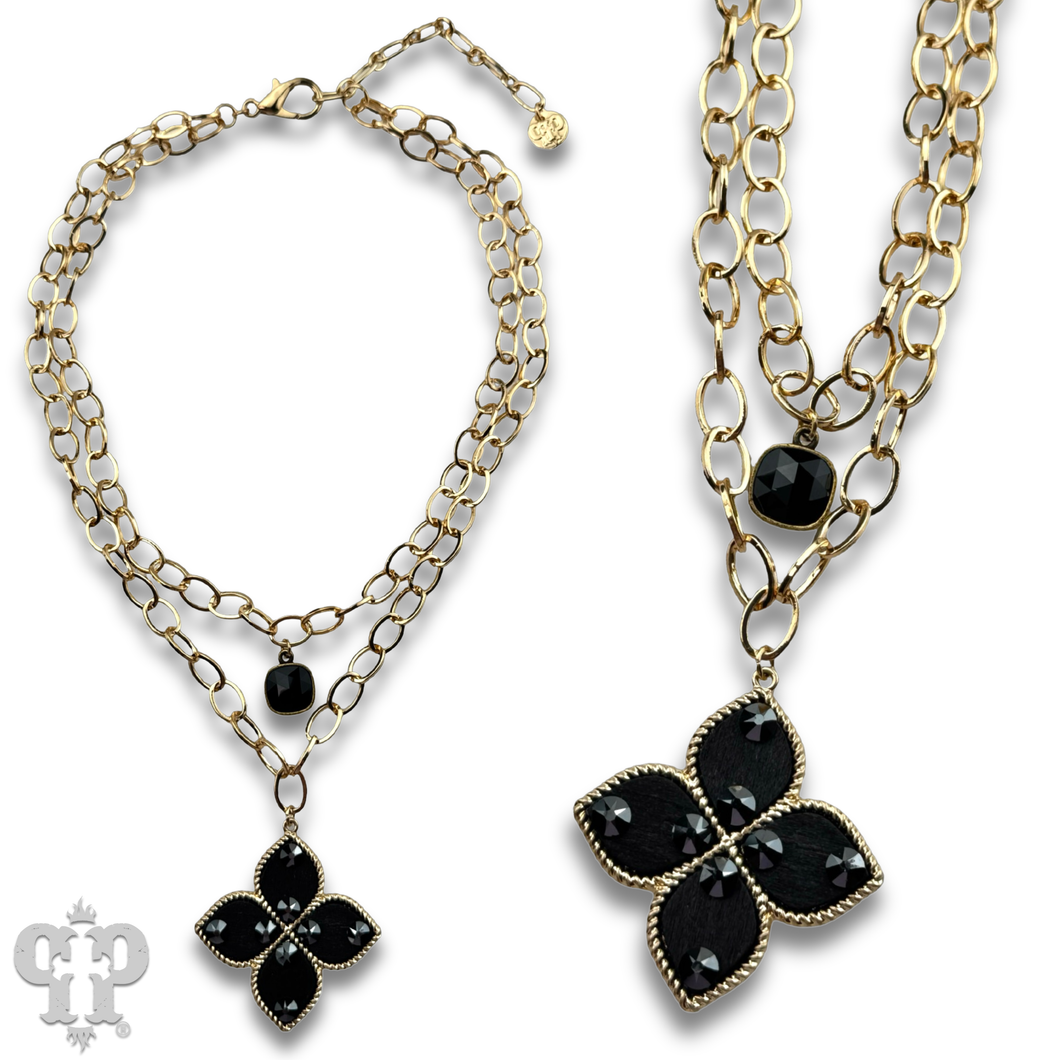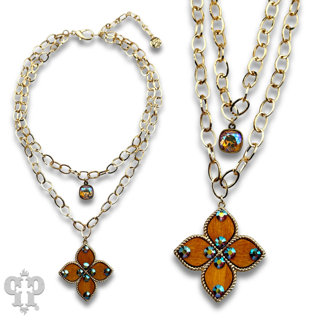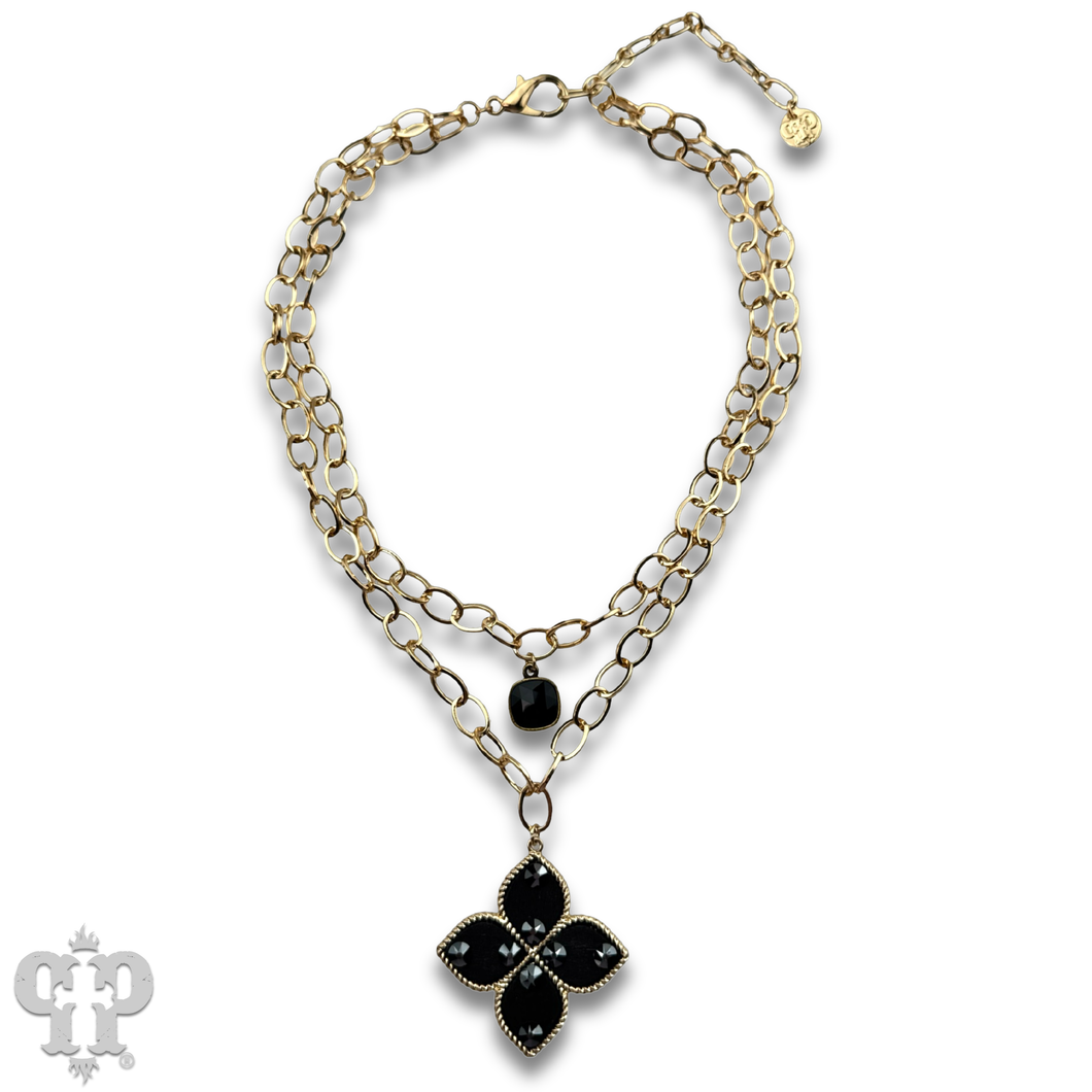 This necklace two rows of gold tone oval link chain. The longer strand has a four point clover charm with handset Austrian crystals. The shorter strand has an Austrian crystal drop in a setting custom made for Pink Panache in the USA.
