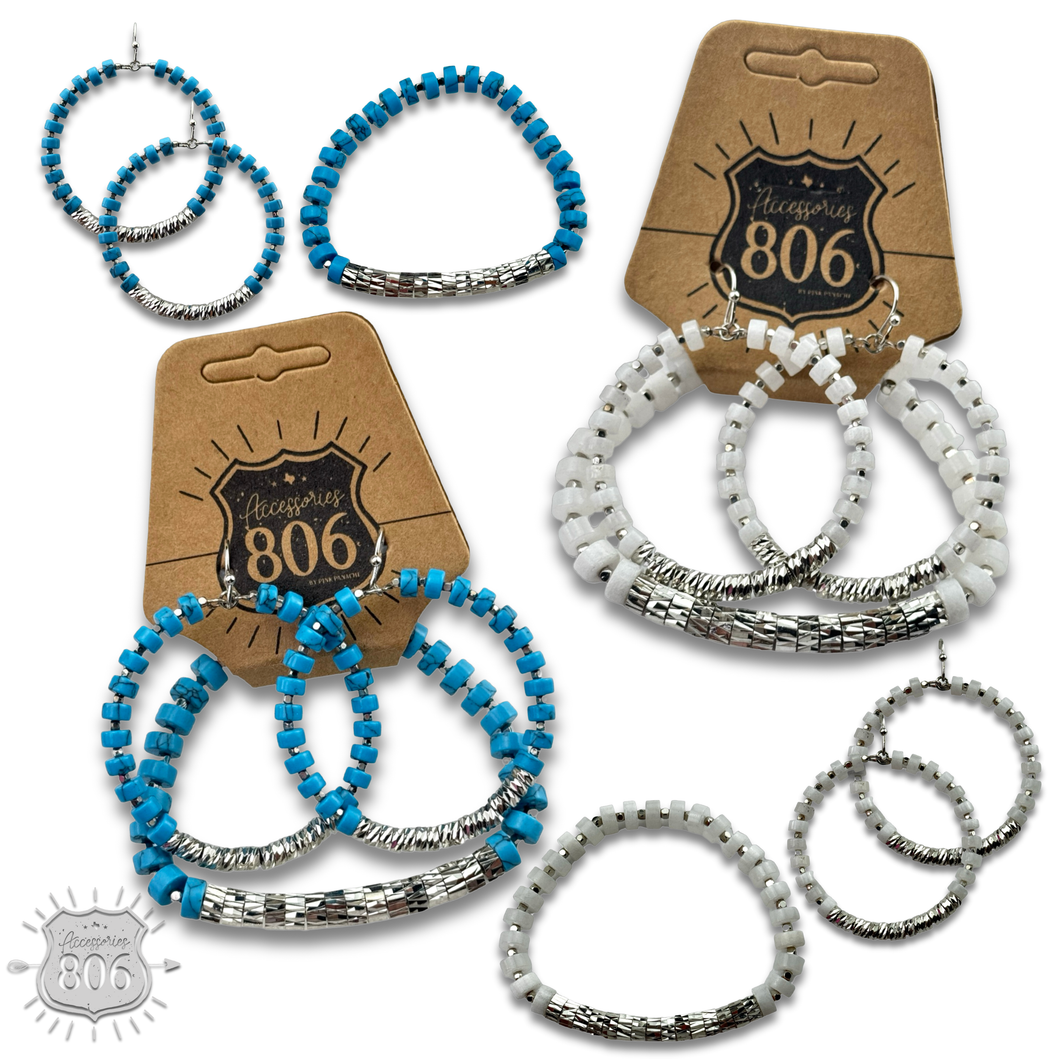 This matching bracelet and earring set comes with saucer shape stones and textured silver beads. Product details * Saucer stone beads * Matching circle hoop earrings * Bracelet is one size * Images enlarged to show detail