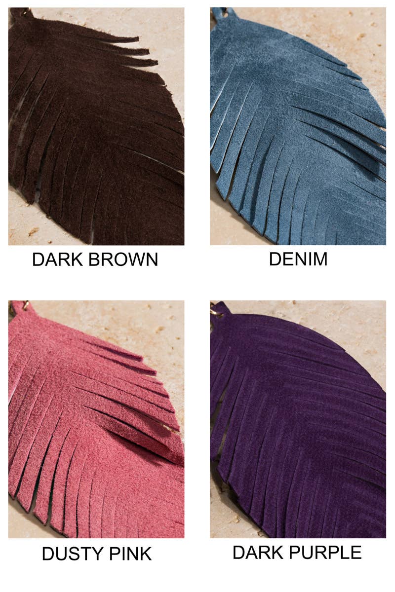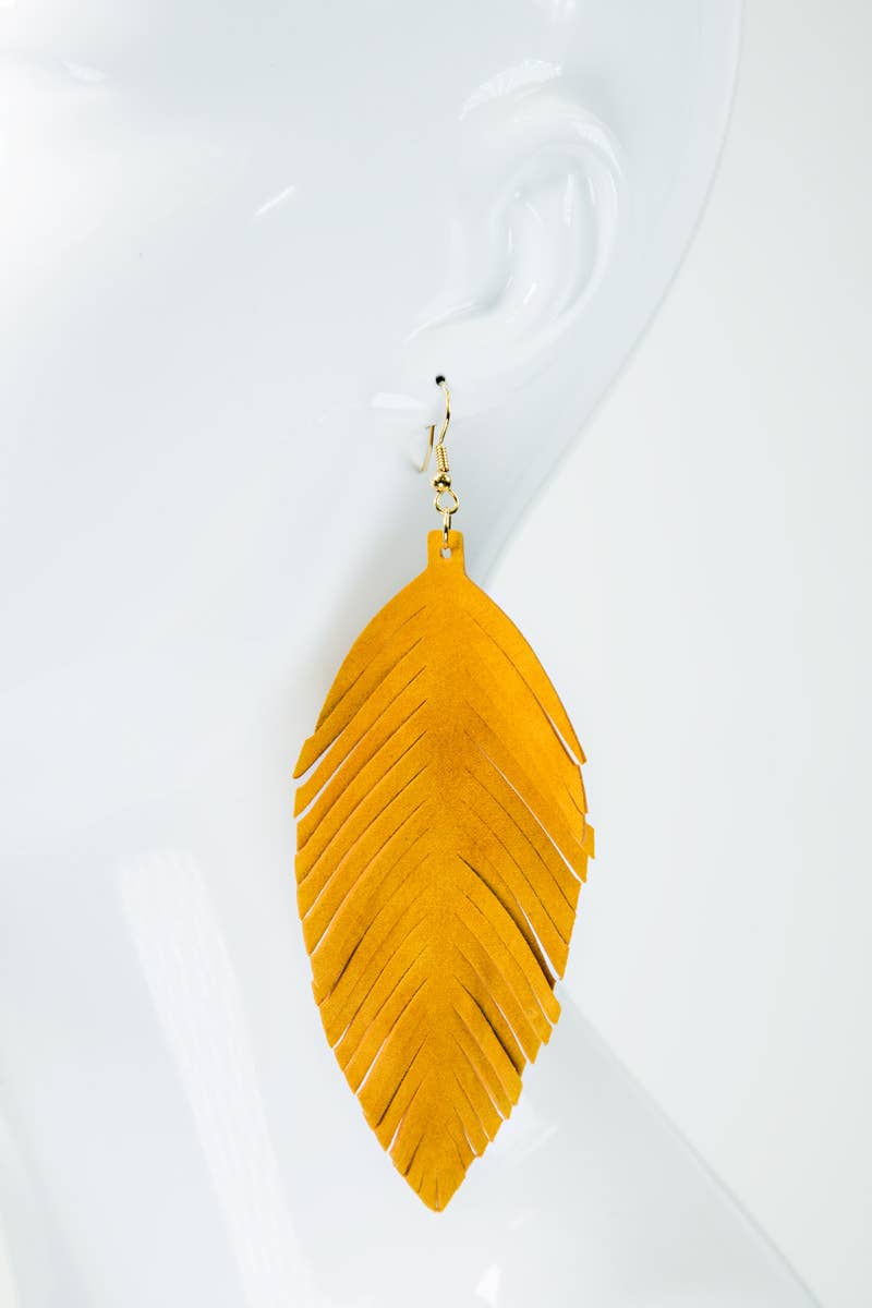 Soft genuine leather leaf dangle fish hook earrings *Genuine Leather *Nickel/Lead Compliant *APPROX. L 4.25" W 2" 0.25oz *Imported