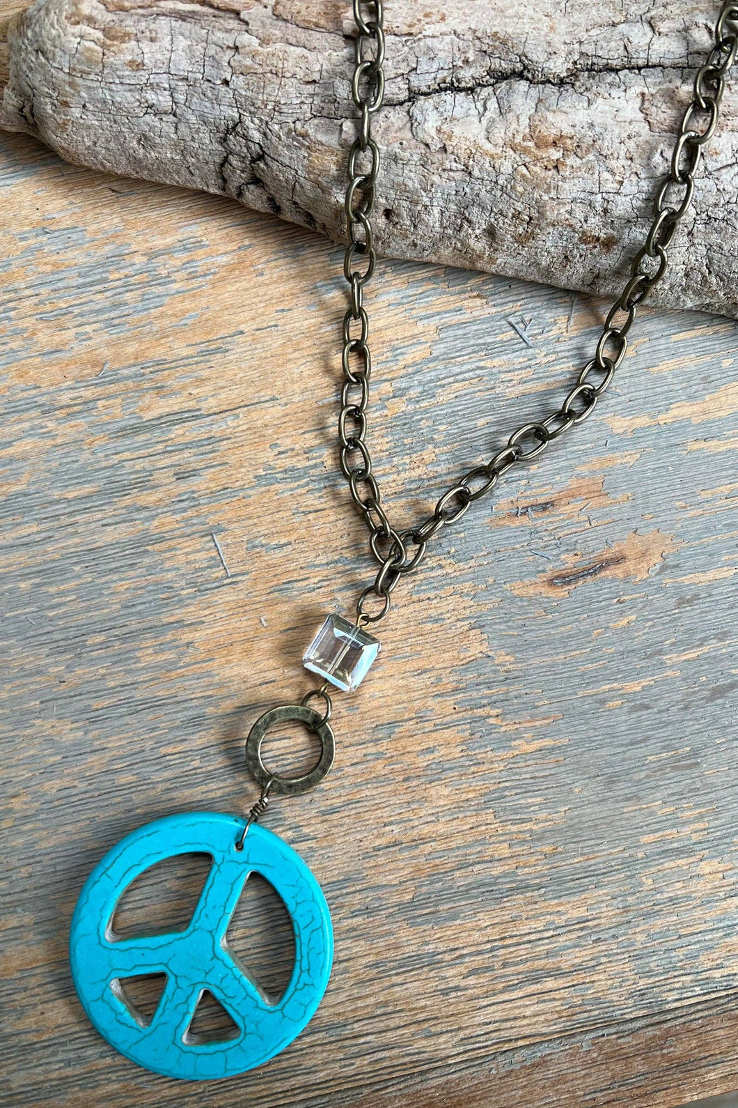 Long chain link necklace with a big peace sign pendant. Includes a large lobster claw closure. Chain Length: 34" Chain Length(when clasped): 17" Pendant Length: 4"