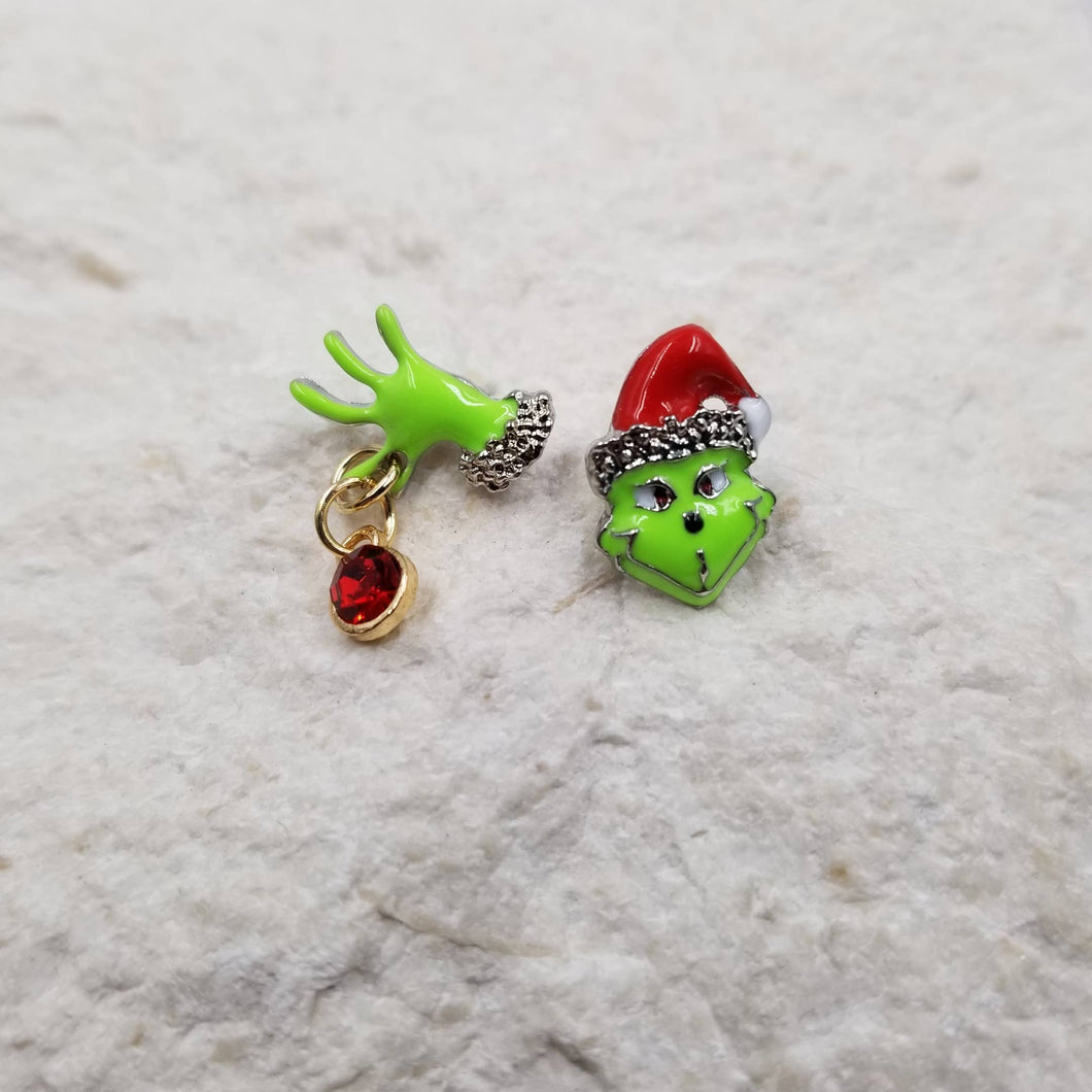 Mini Grinch Christmas Stud Size:0.78 " * 0.47 " Weight :0.5 oz . Material:Alloy . Color:green. Function: Jewelry&Accessories . Application: Women/Girls . Occassion:Party/Office/Casual . Package Includes: 1Pair/Opp Bag .
