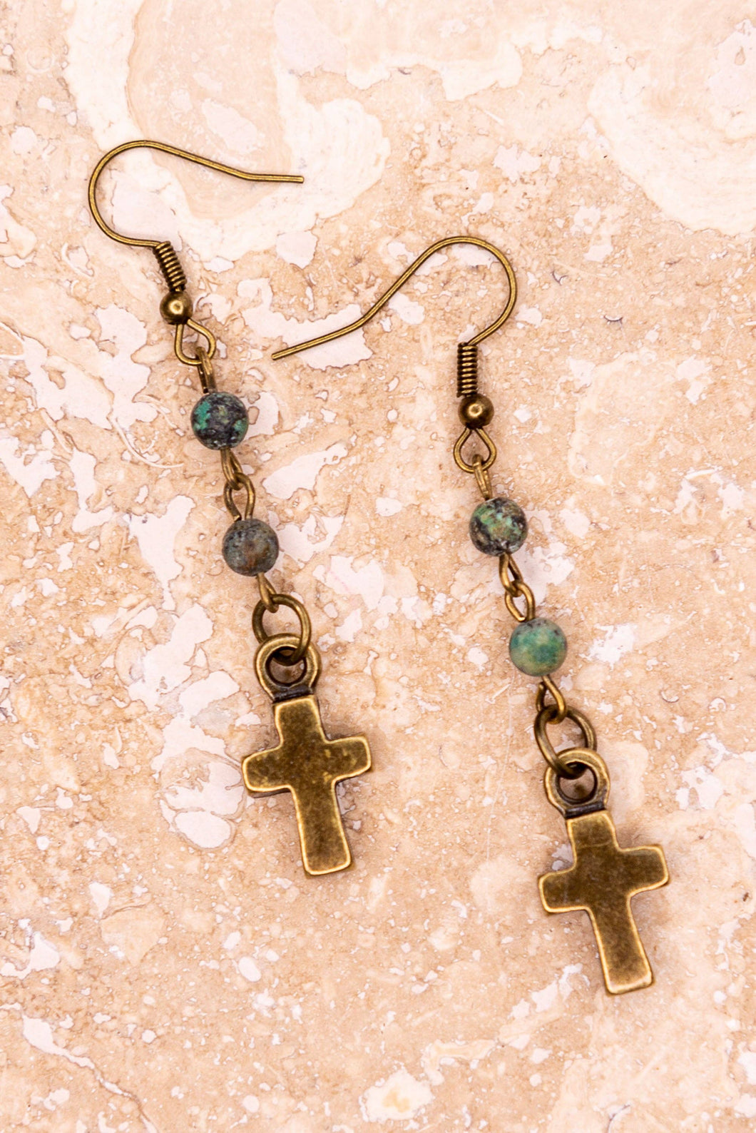 These fishhook dangle earrings have two small African Turquoise stone beads and a small cross charm. They are lightweight. Pairs well with the Phoebe Necklace (#58212)! Length: 2"