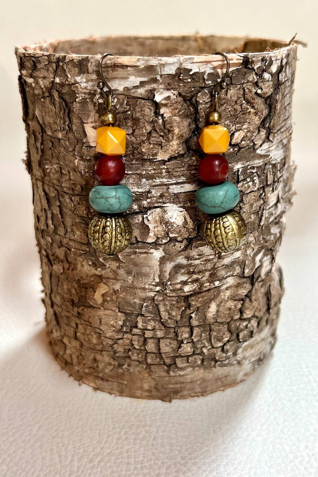 Fishhook dangle earrings with 4 unique beads. Length: 2"