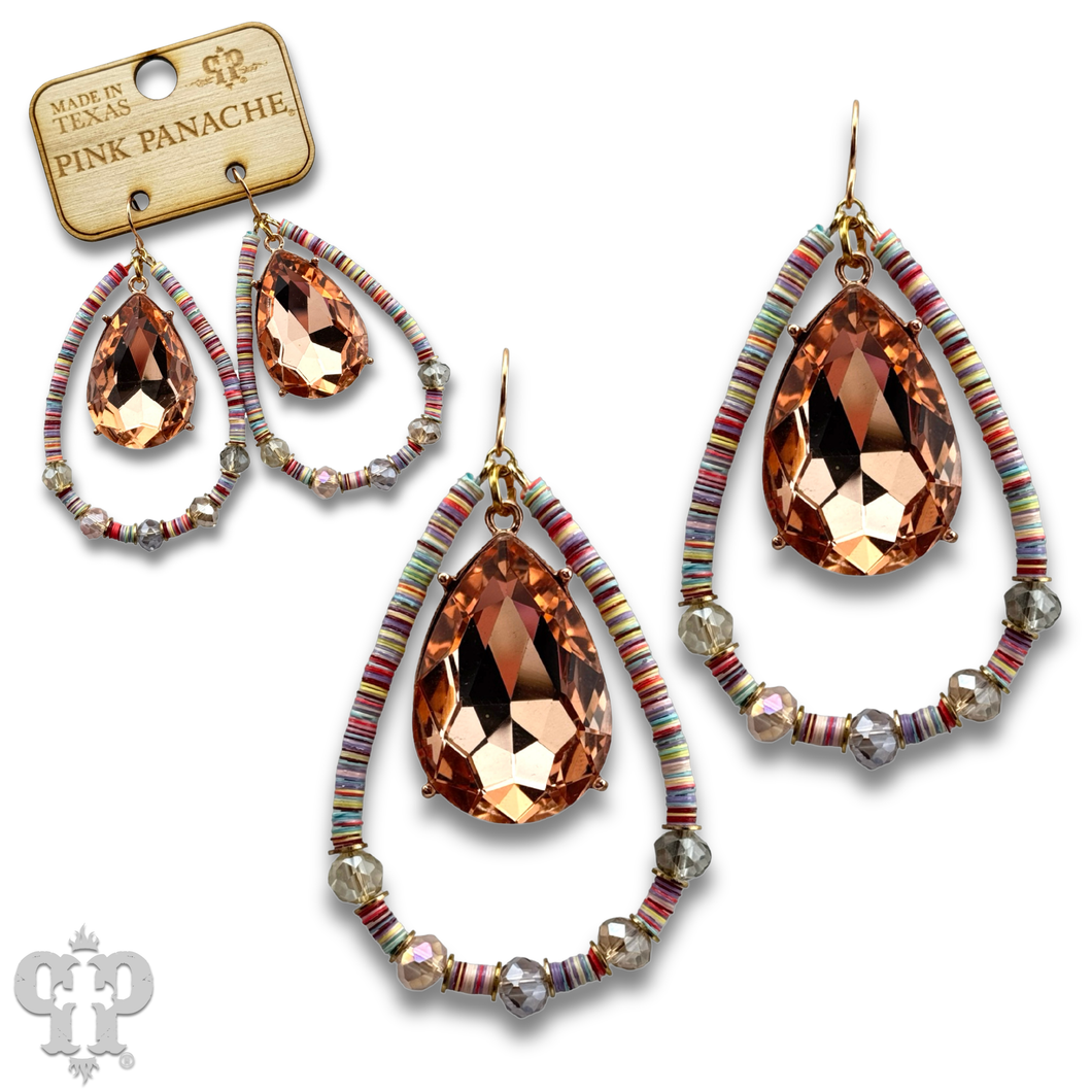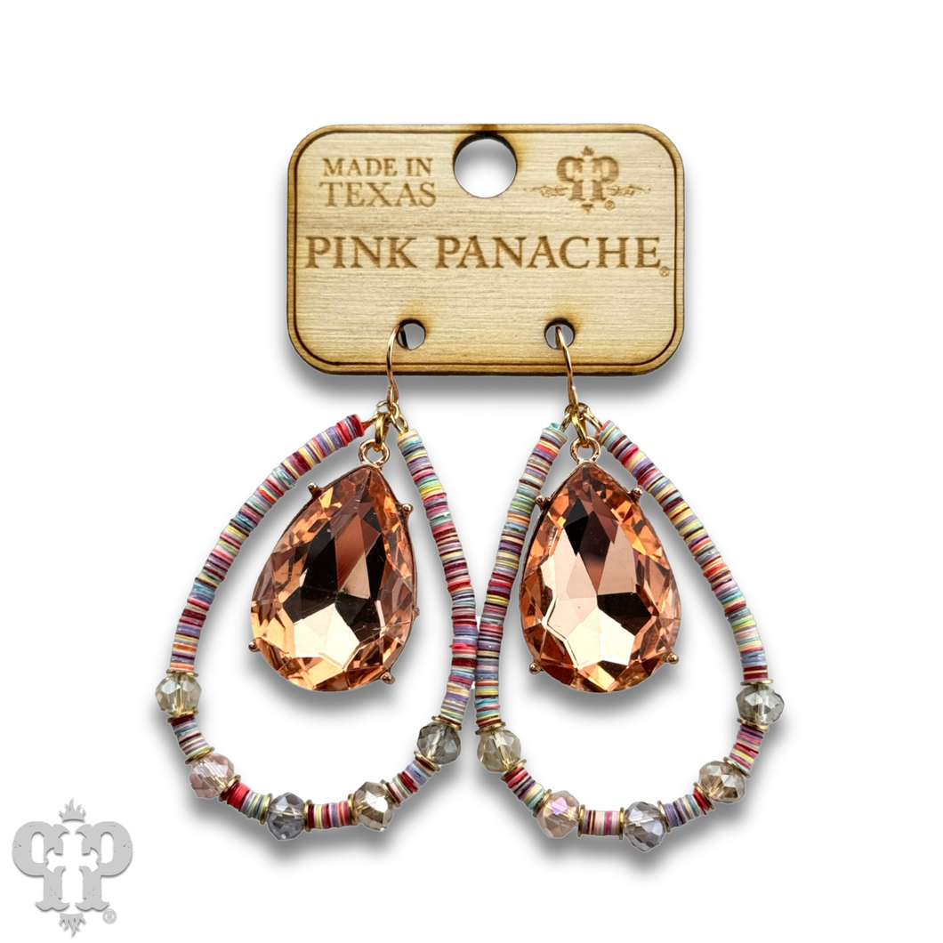 This earring has a mix of pink disc beads and has a large rose pink rhinestone teardrop hanging from the center. Product Details * Rose pink rhinestone teardrop * French hook * Approximately 2.5 inches in length * Images enlarged to show detail