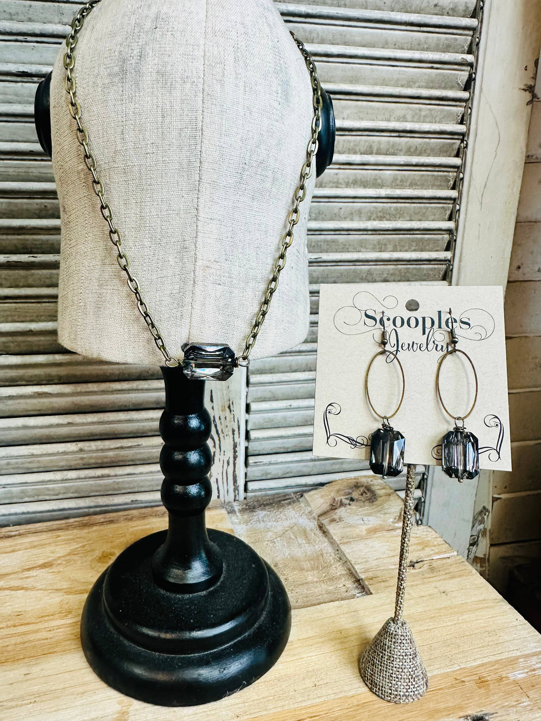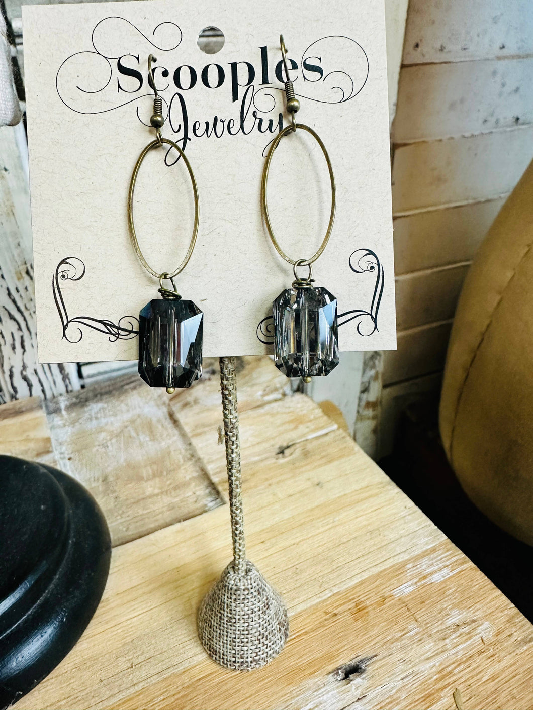 This earring has been the most popular style. This crystal is a Smokey gray faceted crystal that dangles from an oval bronze ring. Costumers love this design and is sold on almost every order.