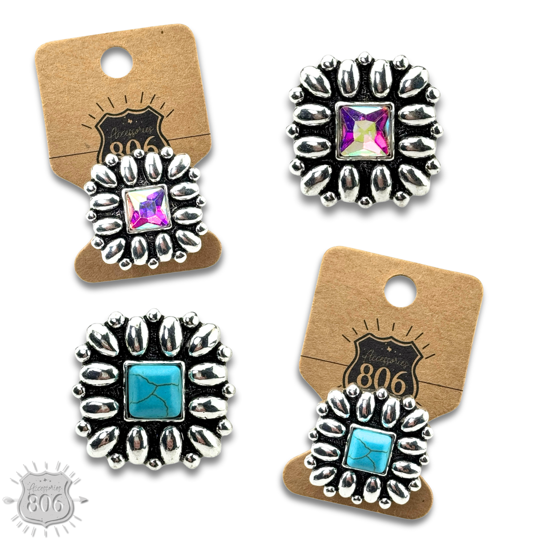 This ring has an adjustable open back. It features a raised bead concho with a square stone center. Product Details * Center square stone feature * Adjustable ring, open in the back * One size fits most * Images enlarged to show detail