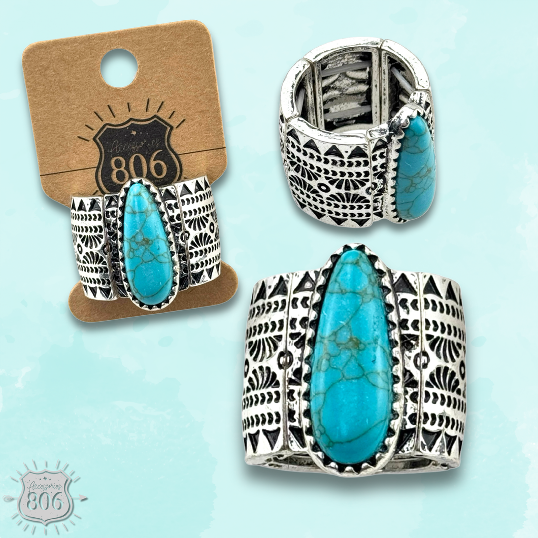 This ring has a native stamped look along with a teardrop shape turquoise color stone feature. Product Details * Turquoise color stone teardrop * Adjustable ring that stretches on and off * One size fits most * Images enlarged to show detail