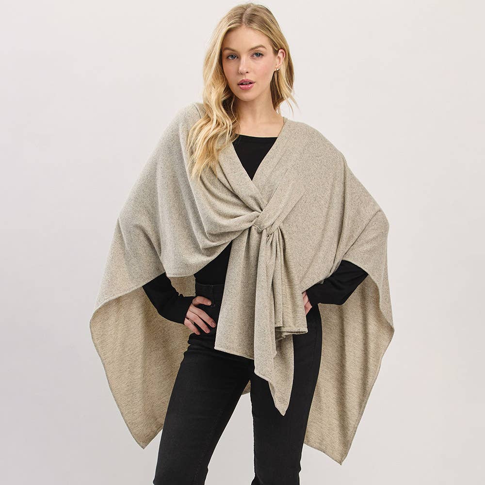 Taupe Asymmetrical Hem Solid Pull Through Draped Tie-Front Wrap Poncho