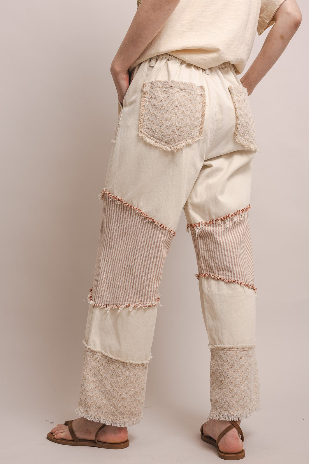 Bone Contrasting Panel Patchwork Pants feature a relaxed fit with a straight leg silhouette that moves effortlessly through your day. Crafted from a mix of cotton twill, striped cotton, and textured woven fabrics, this patchwork design creates visual interest with contrasting panels throughout.