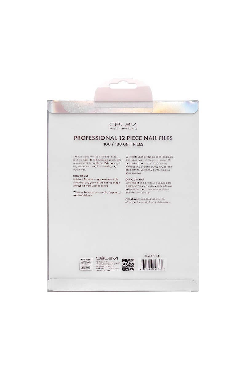 Celavi Professional 12pc Nail Files. This set includes 12 durable, two-sided nail files, each designed to meet all nail care needs. The 180 medium grit side provides a smoother finish, perfect for refining natural nails and adding a polished touch. On the other hand, the 100 coarse grit side is ideal for shaping and removing bulk from acrylic nails, allowing for precise contouring and a flawless shape. Perfect for both beginners and professionals.