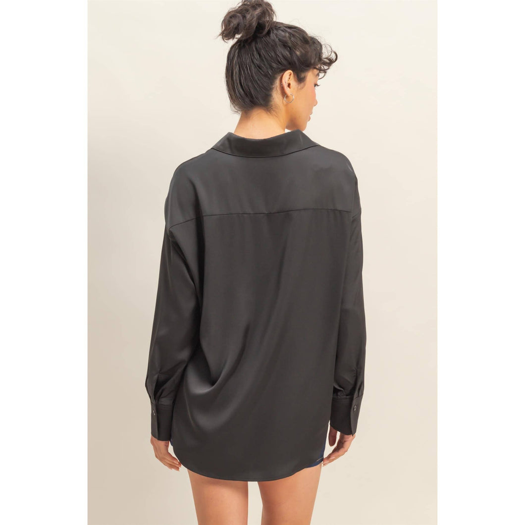 This Elegant Collared V-Neck Satin Blouse Is A Stylish And Versatile Addition To Any Wardrobe. The Satin Fabric Adds A Touch Of Luxury And Sophistication, While The Relaxed Fit Ensures Comfort And Ease Of Movement. Featuring A Classic Collar And A Deep V-Neckline, This Blouse Is Perfect For Both Casual And Formal Occasions. The Long Sleeves End In Buttoned Cuffs, Adding A Tailored Finish. Pair It With Jeans For A Chic Daytime Look, Or Tuck It Into A Skirt For A Polished Evening Outfit. 97% Polyester 3% Spandex Model Is 5' 7" Tall, 32" Chest, 25" Waist, 36" Hips And Wearing A Size Small Imported. Designed in the USA