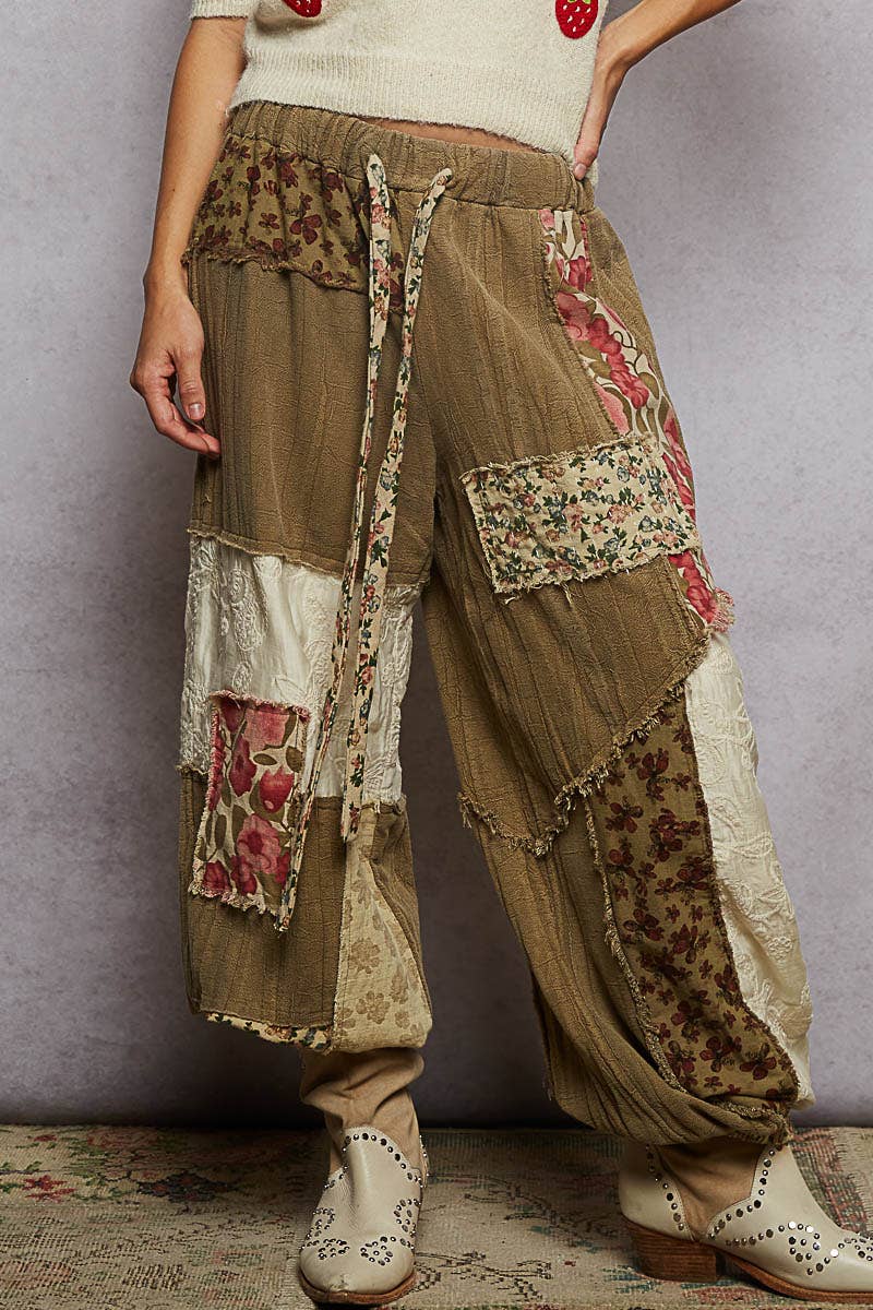 Crafted in soft double gauze, these roomy fit bottoms showcase varied patchwork panels mixed with contrast patches and stitch detailing for a handcrafted feel. Finished with an accented drawstring at the waist, they bring comfort, individuality, and a touch of vintage-inspired charm to your look.