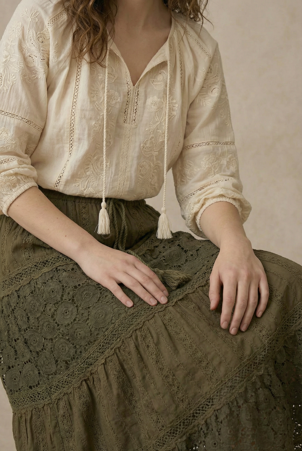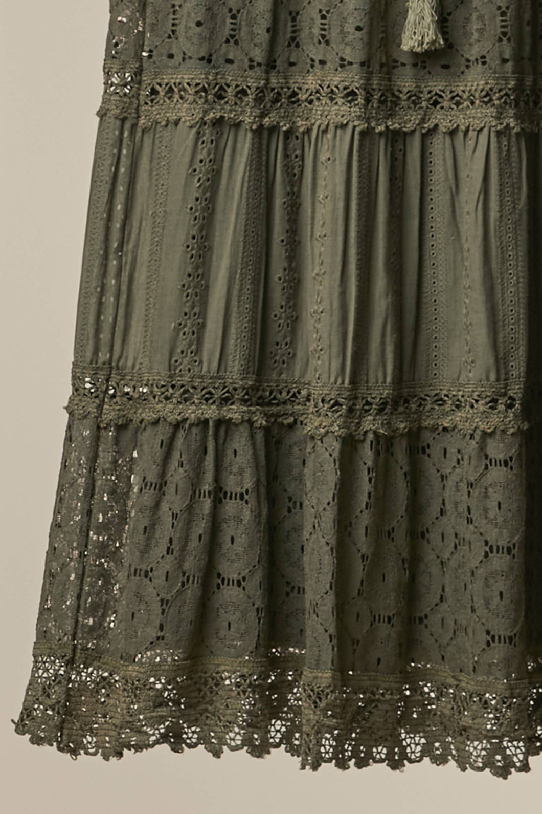 Olive Elastic Waist Maxi Mello Skirt with Lace Trim