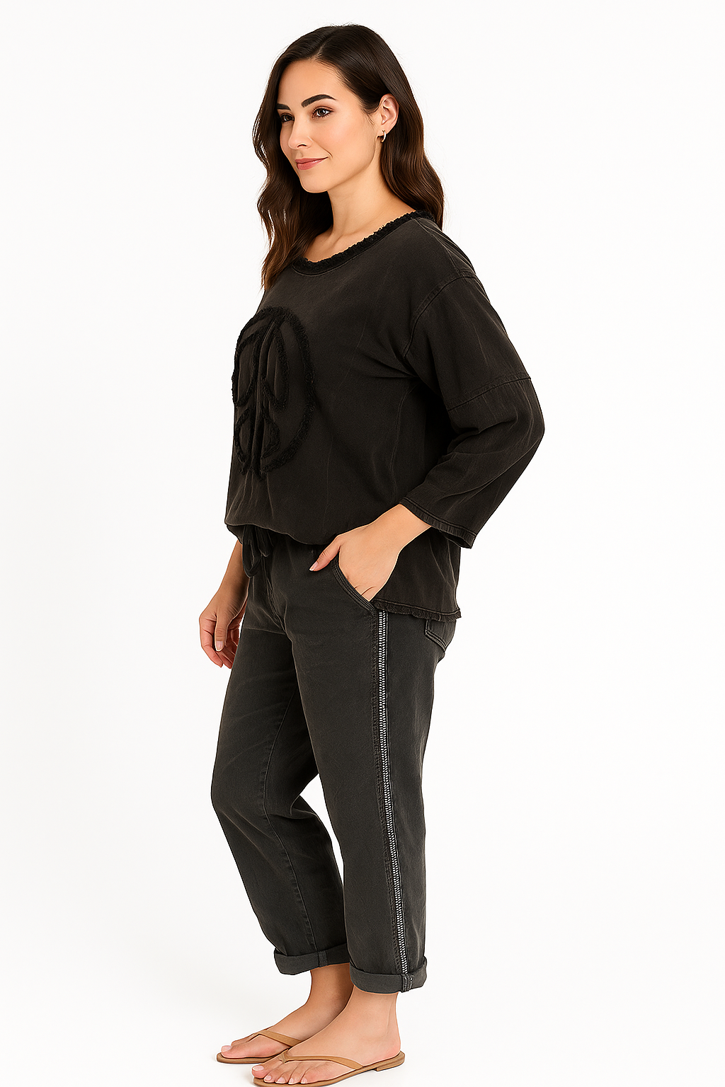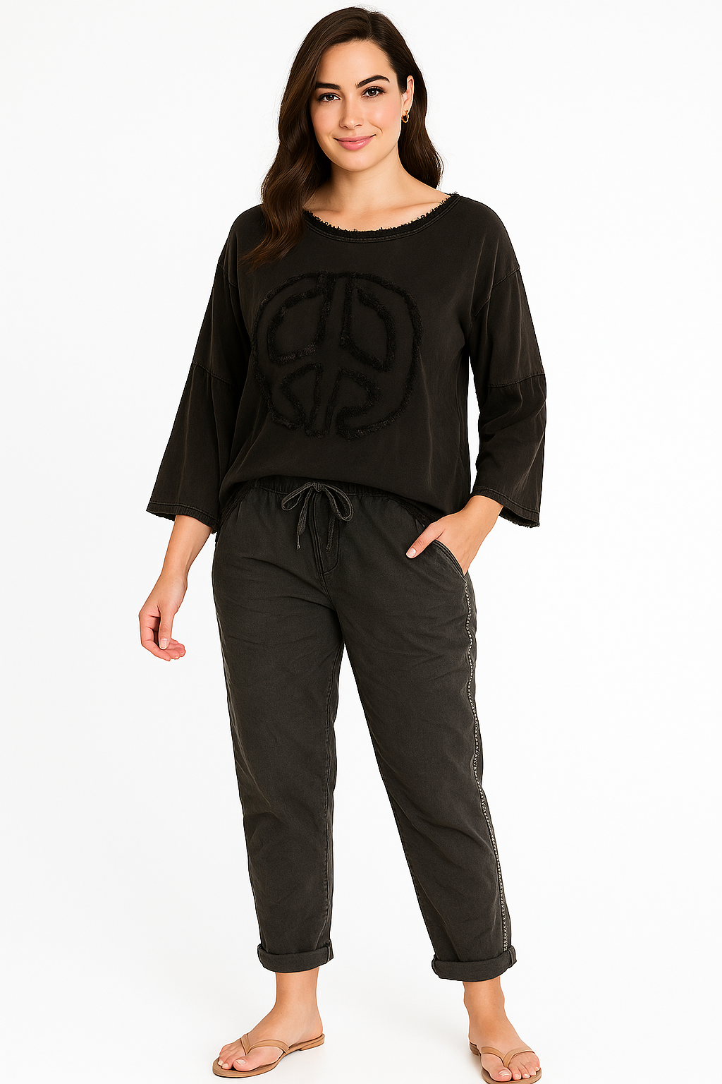 The Ruffle Peace Top combines stylish design with cozy comfort, making it an essential addition to your wardrobe. Crafted with attention to detail, its ruffled accents add a touch of elegance while maintaining a relaxed fit for all-day wear. Perfect for layering or wearing on its own, this top offers both versatility and a modern look that suits various occasions. Experience the blend of fashion and comfort with the Ruffle Peace Top.