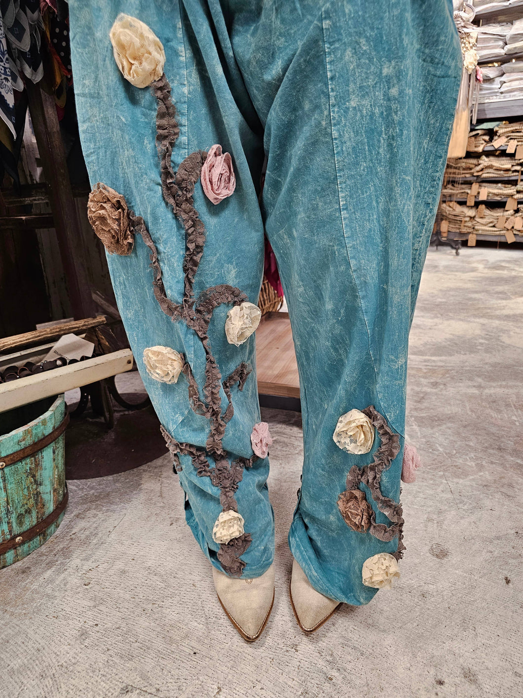 These pretty pants are made to tie back with the LOVE RIBBON SHIRT. These one size pants have lovely ribbon roses on the legs and have a draw string in their elastic waistband. So comfy and lightweight. Perfect with this top or will tie back with any fun shirt you may have.