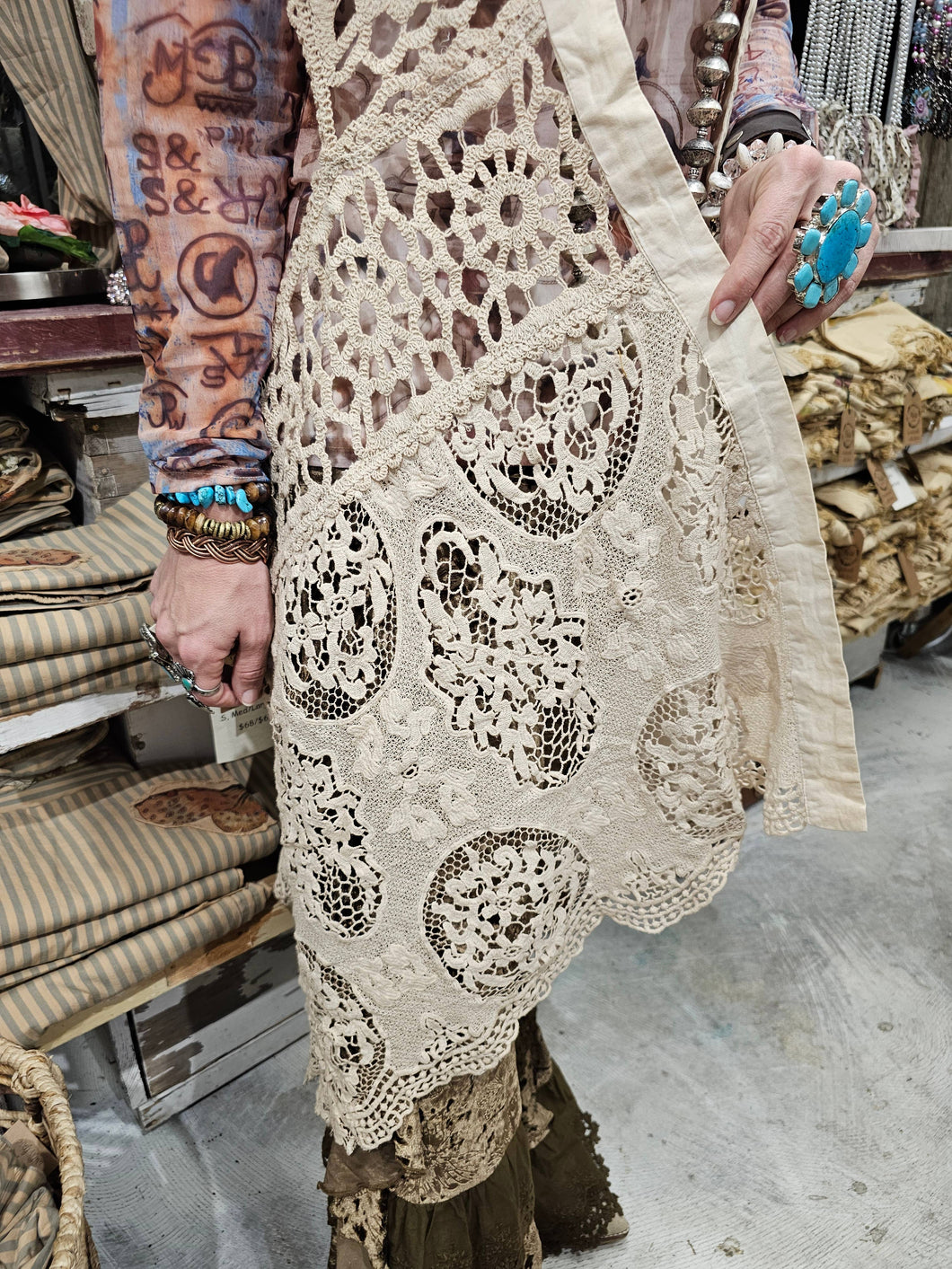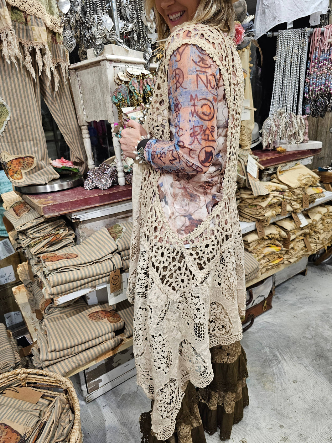 Beautiful over everything! This open weave crochet duster is distressed and ready to wear. Can be worn over any RARE BIRD items from fancy to Denim jeans.