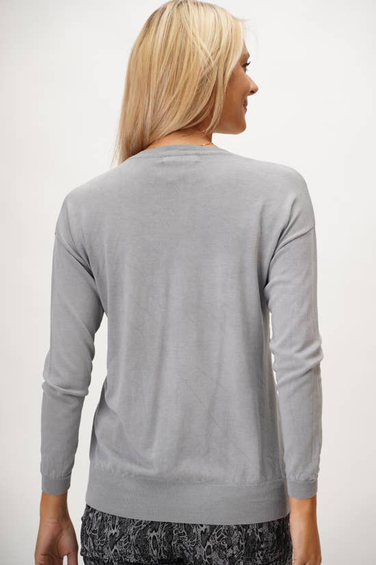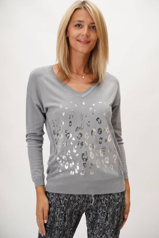 Looking for a fun twist on your everyday knit? Look no further! This Grey Metallic Leopard V-Neck Knit features a scattered foil design for a unique touch. The lightweight, fine-gauge knit and relaxed fit make it easy to pair with any bottoms. Plus, with a ribbed trim and easy care instructions, it's perfect for any fashionista!