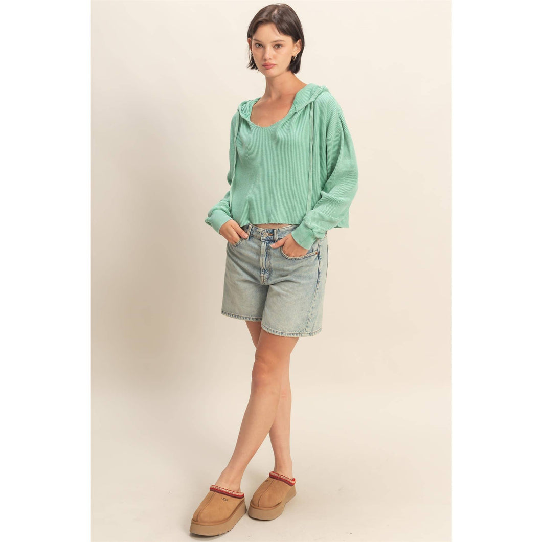 Emerald Mineral Washed Cropped Waffle Knit Hoodie