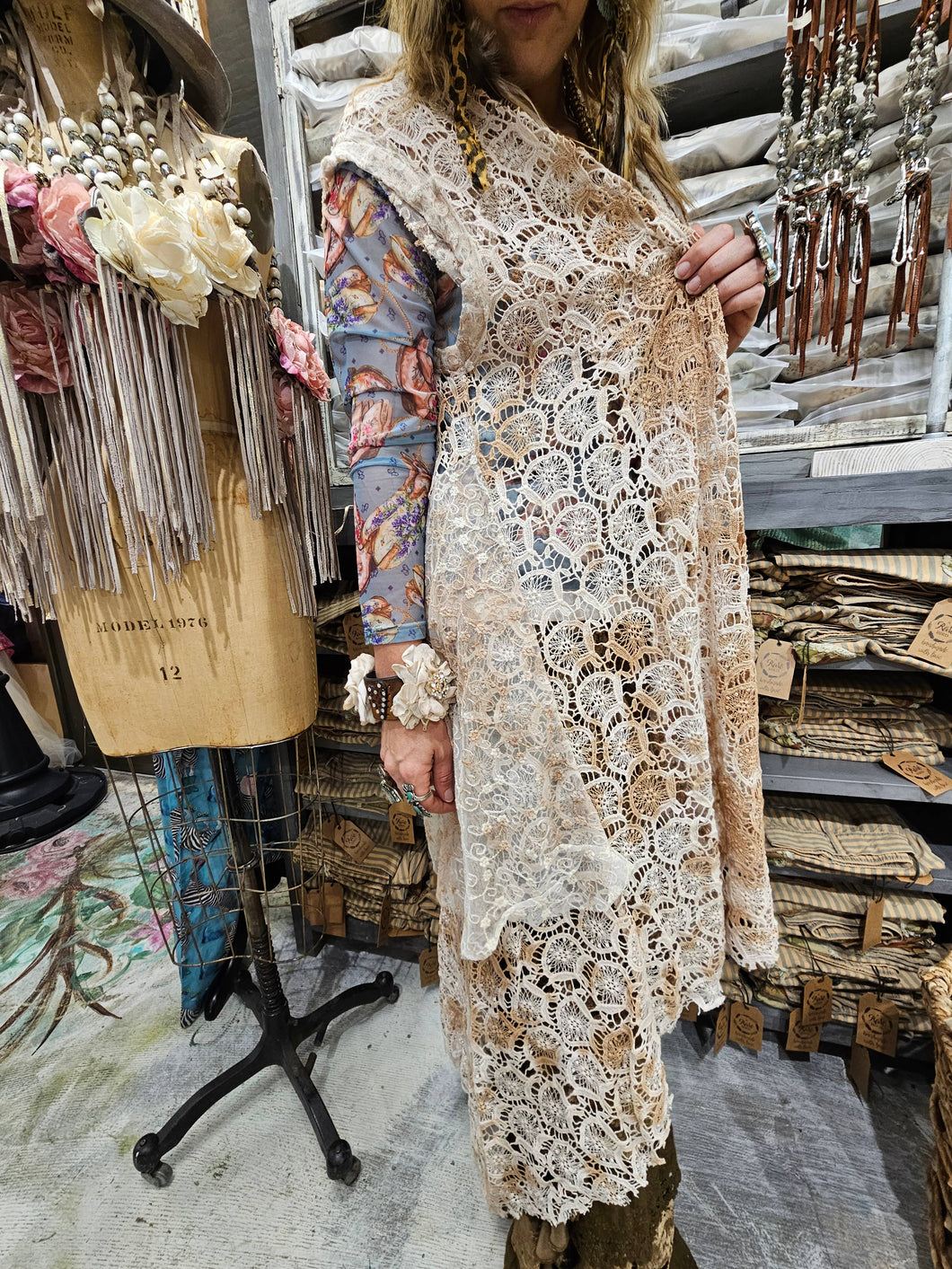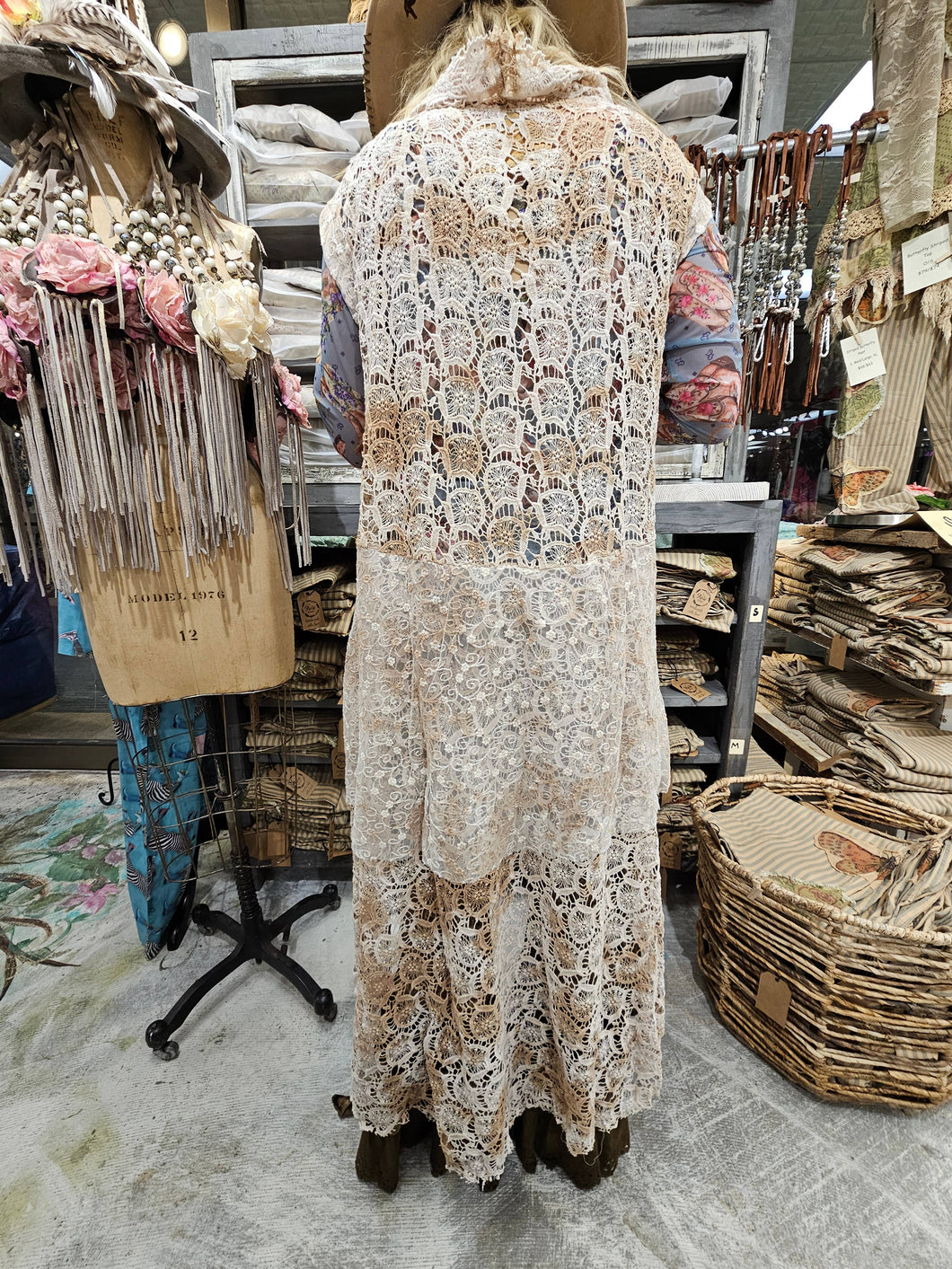 Absolutely stunning lace duster is made with beautiful crochet lace with an added soft layer of embroidered lace. This piece is distressed and one of a kind so it becomes a collectors piece for sure. Fits sizes 2-2x.
