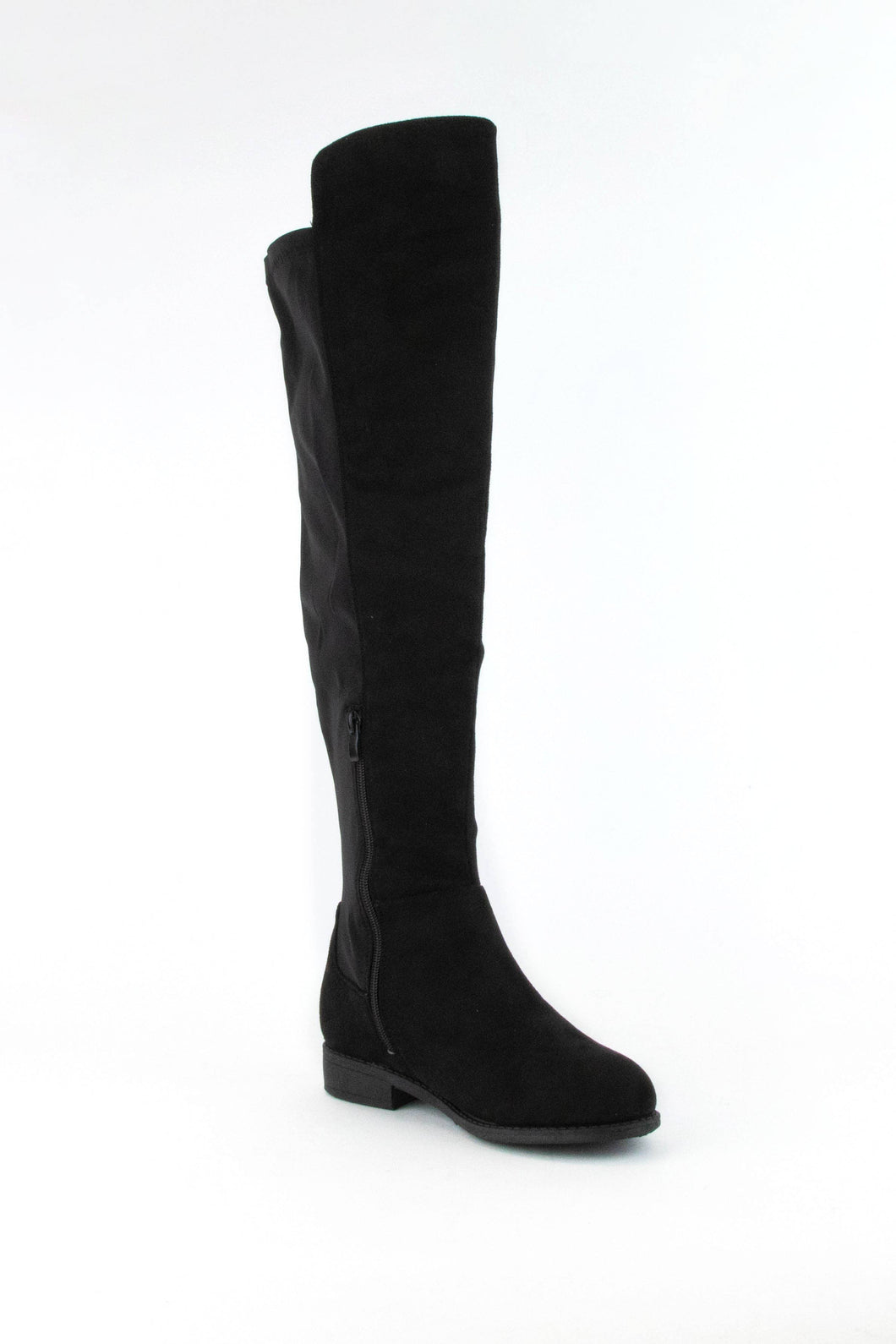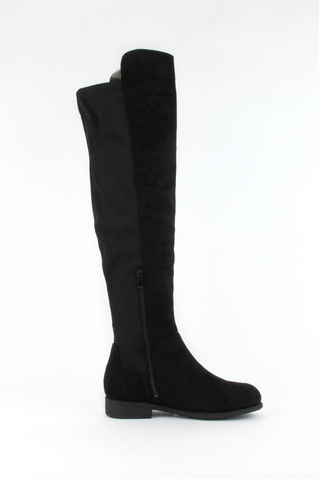 Step up your style with these Black Over Knee Riding Boots! Crafted from soft faux suede, they offer a comfy fit thanks to back-stretch construction and an easy-access inside zipper. With a 21.75" shaft that turns heads and a modest 1.25" heel for all-day wear, these boots are your best pick for fall and winter adventures. Classic and charming, they pair perfectly with any outfit that needs a little extra flair.