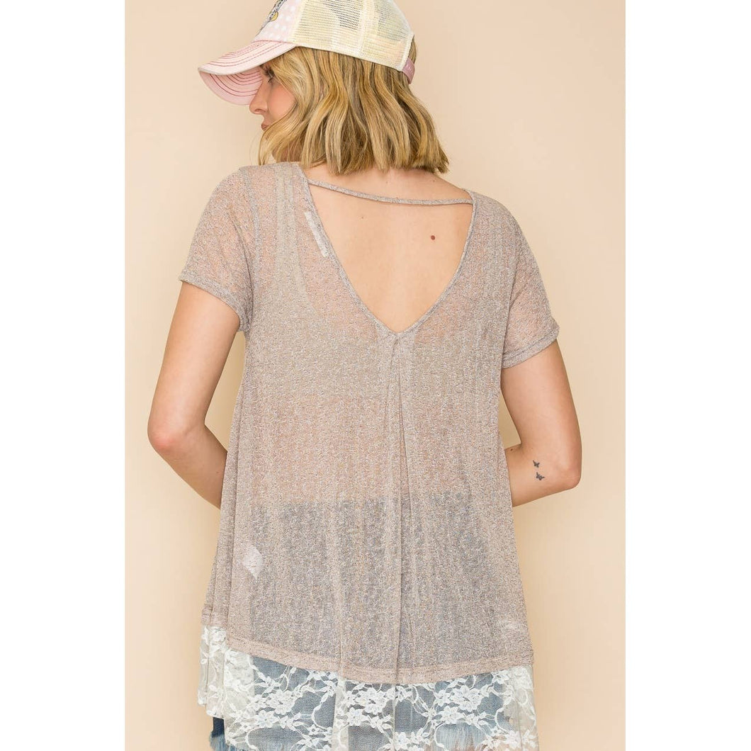 Taupe Semi V Neck Short Sleeve Knit Top with Laces