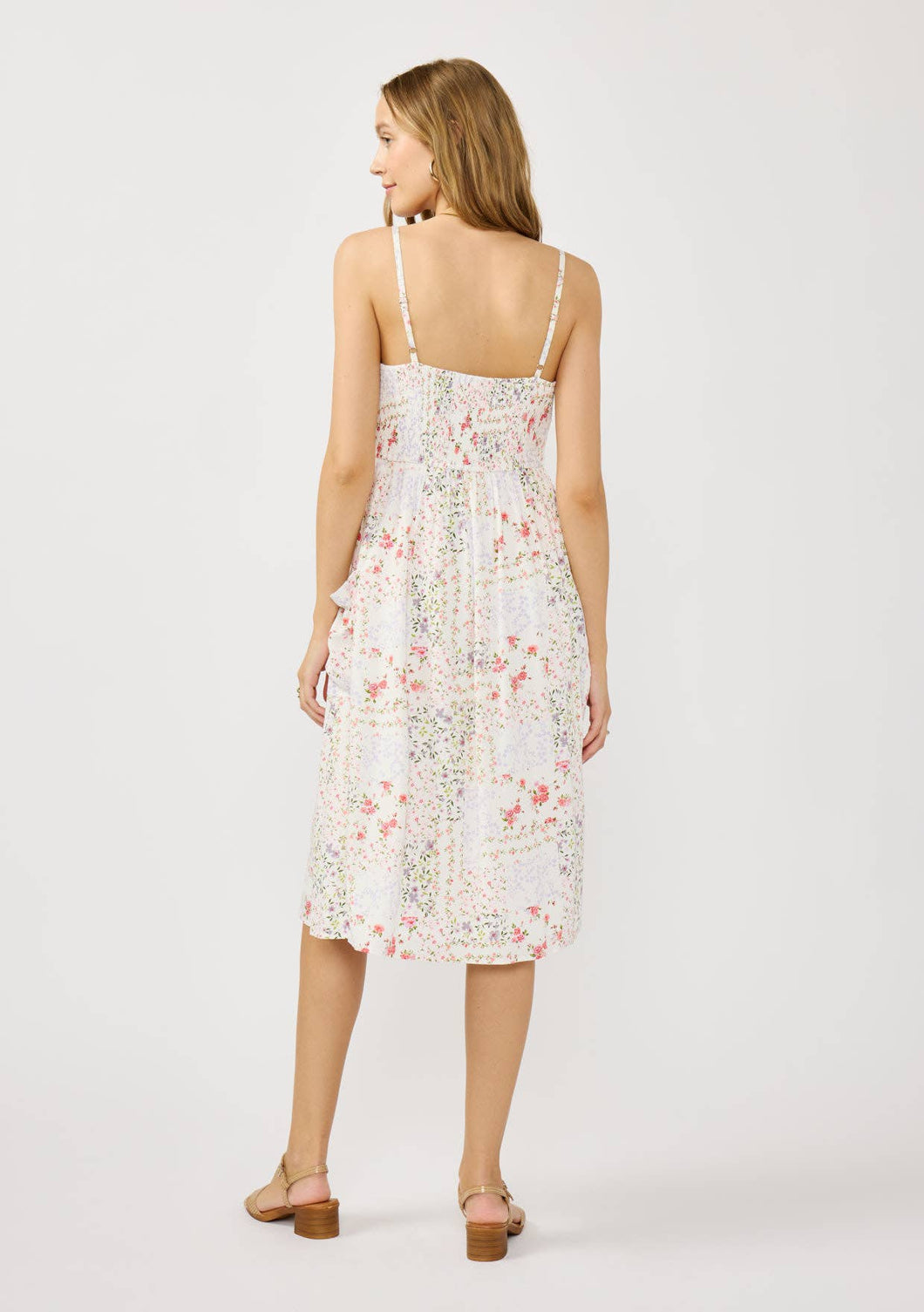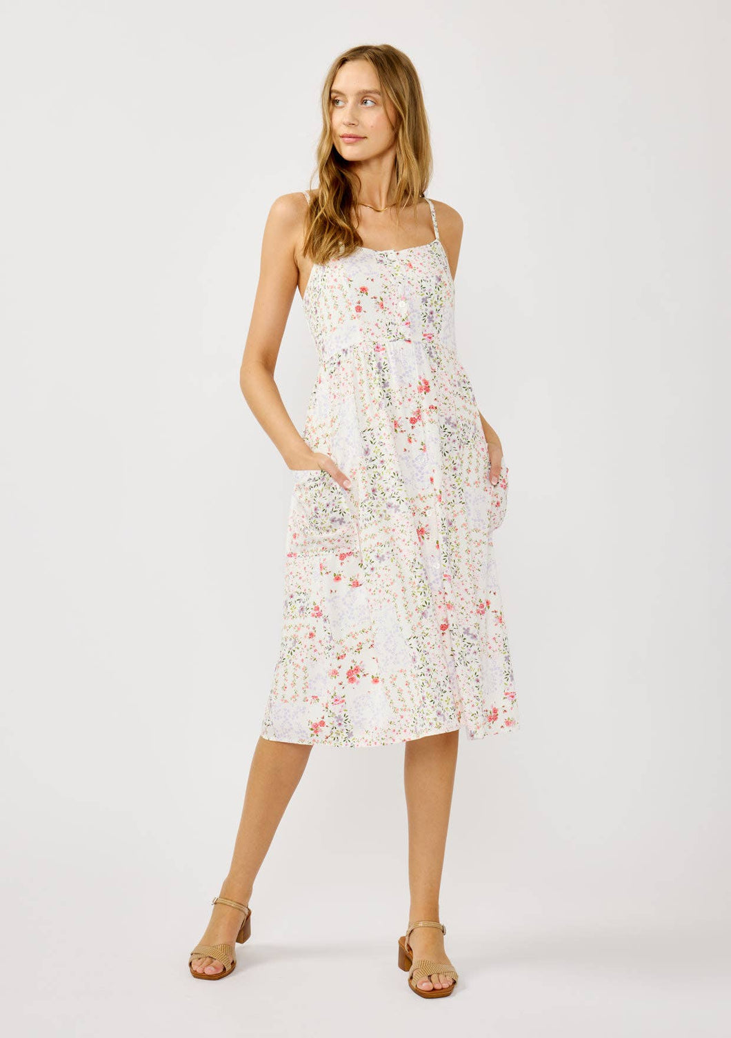 Effortlessly stylish, this flowy maxi tea dress features a sweetheart button front neckline and spaghetti straps, adorned with an all-over patchwork ditsy print on soft rayon dobby fabric and a breathable cotton voile lining for added comfort. The smocked back bodice, elasticized smocking at the top and bottom, and patch pockets combine vintage-inspired charm with a modern fit, making this dress a versatile and flattering choice for any summer outing.