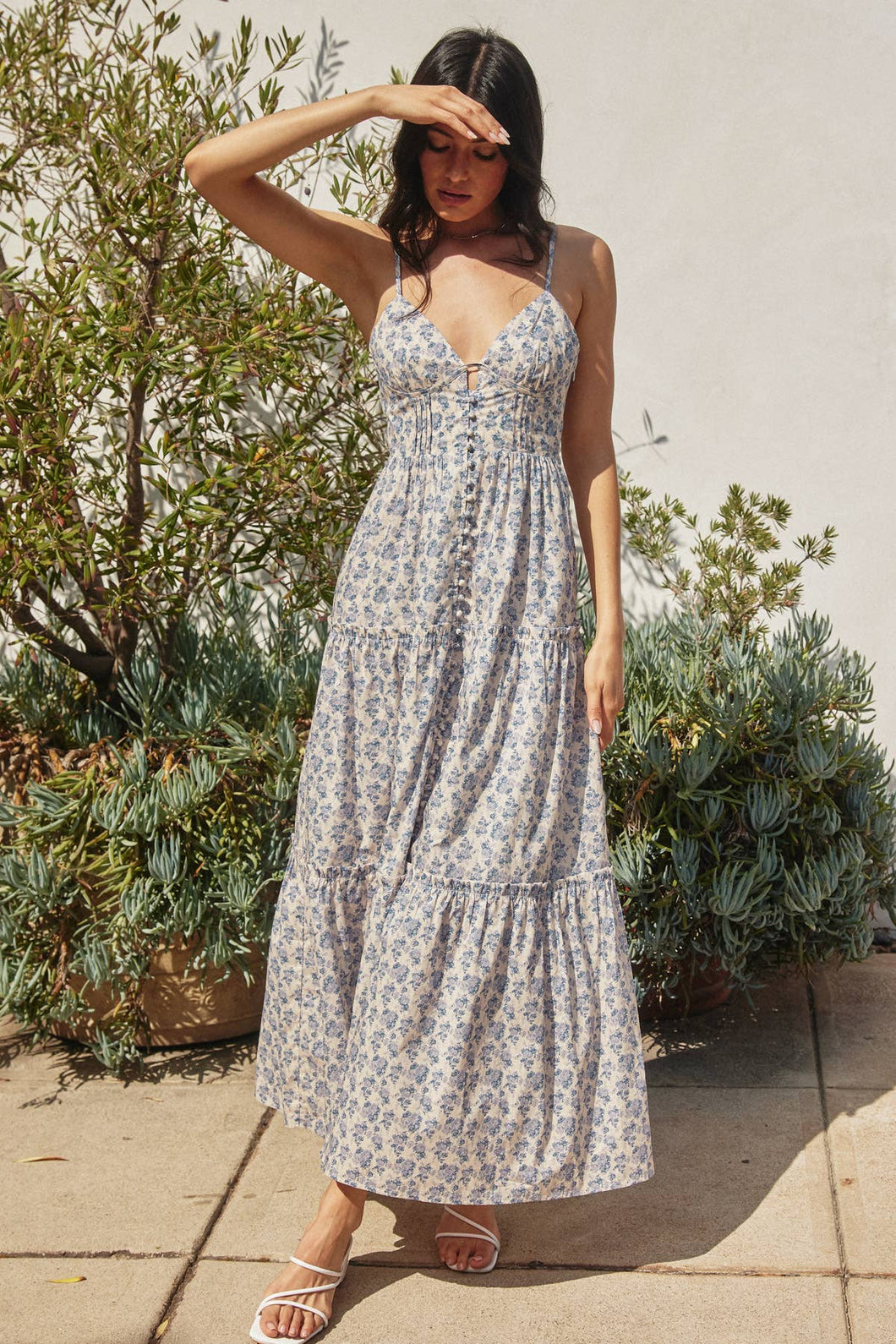 Ditsy floral maxi dress featuring bustier bodice and a full bodied skirt. Model is 5'8" and wearing size Small. - Plunging neckline - Cup detailing - Cutout at the bodice - Front button placket - Adjustable slim shoulder straps - A-Line with front slit - Tiered skirt with small ruffle trims - Hidden side zipper closure - Back smocked panel - Lined Shell: 100% Cotton Lining: 100% Cotton