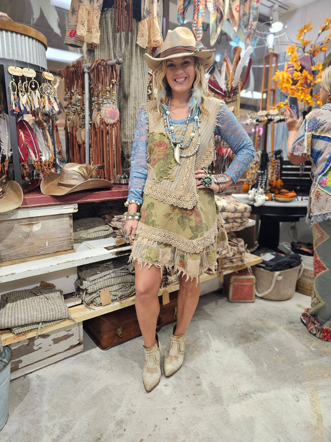 A pretty hand-stitched shirt dress made from vintage inspired fabrics of roses and butterflies. Thoughtfully detailed with a tie to cinch at back if needed Effortless and romantic, flattering on everyone. Pants to match also available. *ALL ITEMS ARE OVERSIZED AND NOT U.S. STANDARD SIZING - DUE TO THE VINTAGE SHABBY CHIC STYLE IN WHICH THEY ARE DESIGNED*