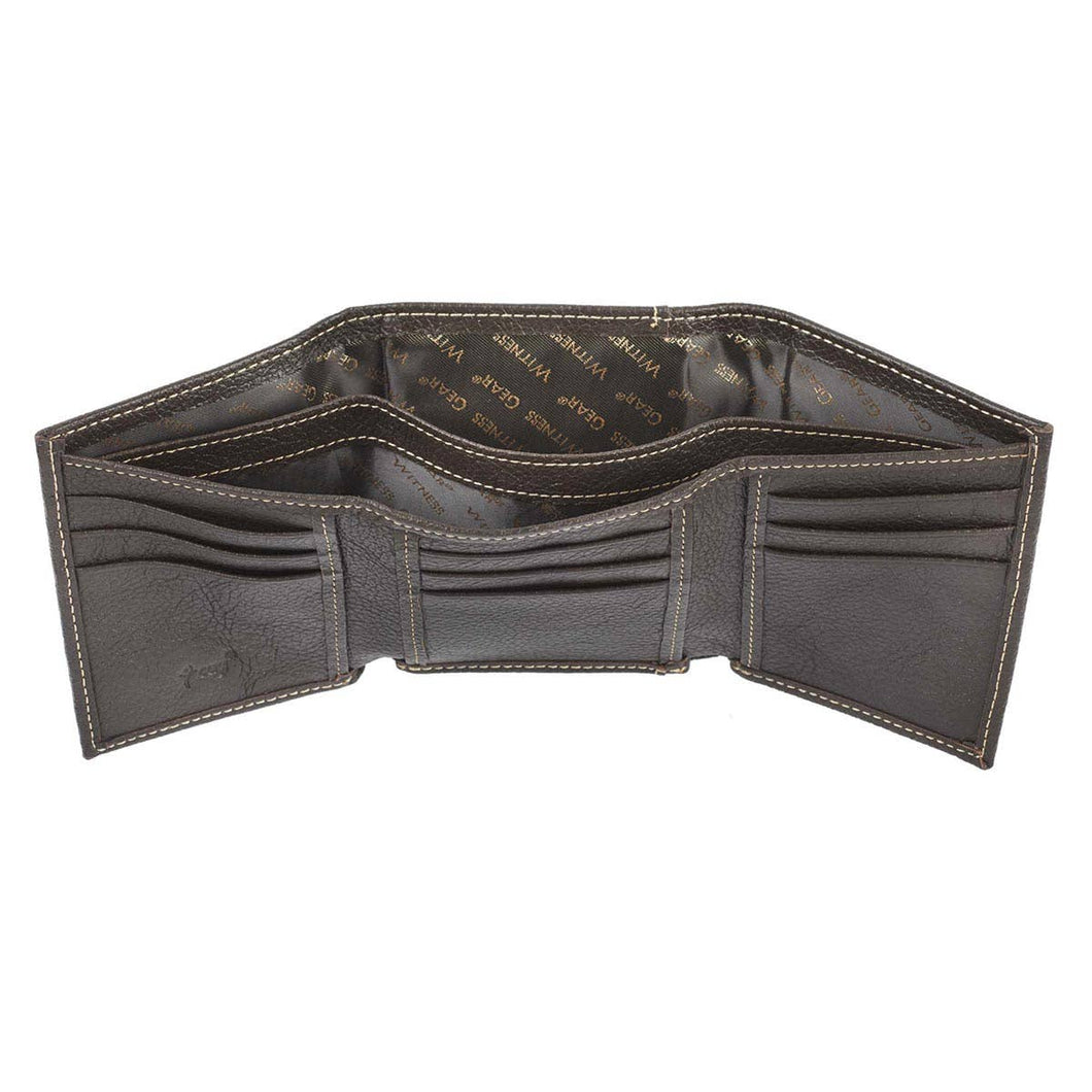 Espresso brown design with a small three cross engraved brass badge, Genuine full grain leather, Topstitched, Trifold, Back slip pocket, 2-section billfold, 3 interior multi-purpose slip pockets,, 9 interior credit card slots, RFID-blocking technology, See Leather Care Guide for maintenance, Wipe with damp cloth to clean, Packaged in gift box, Wallet Size: 4.3” x 3.3” x 0.9” (109 x 84 x 23mm), Gift Box Dimensions: 5.2” x 3.9 ” x 1.3” (131 x 100 x 34mm)
