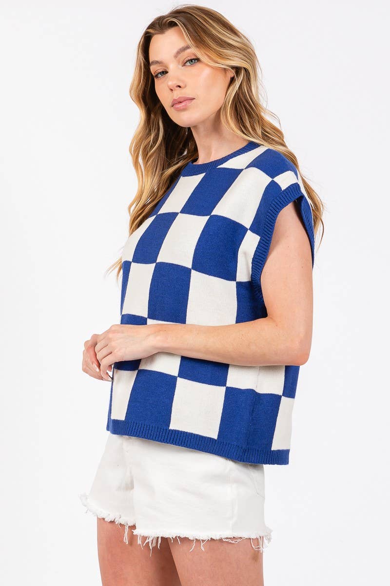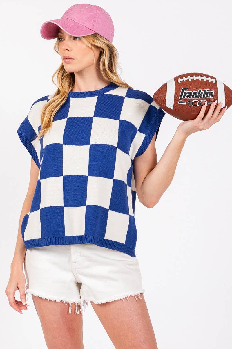 Blue White Checkered Knit Sleeveless Game day Top – B'Dazzled Shop