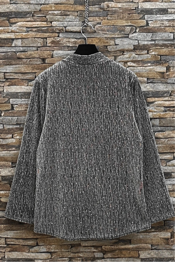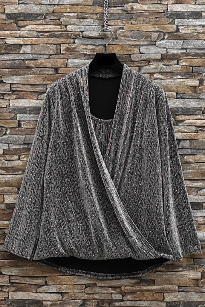 Crafted from a soft, shimmery fabric, it features a flattering draped front and a subtle V-neckline for an effortlessly sophisticated look. The long sleeves add refinement, while the relaxed fit ensures comfort and elegance. Ideal for pairing with tailored trousers or a sleek skirt, this blouse brings a touch of sparkle to every holiday celebration.