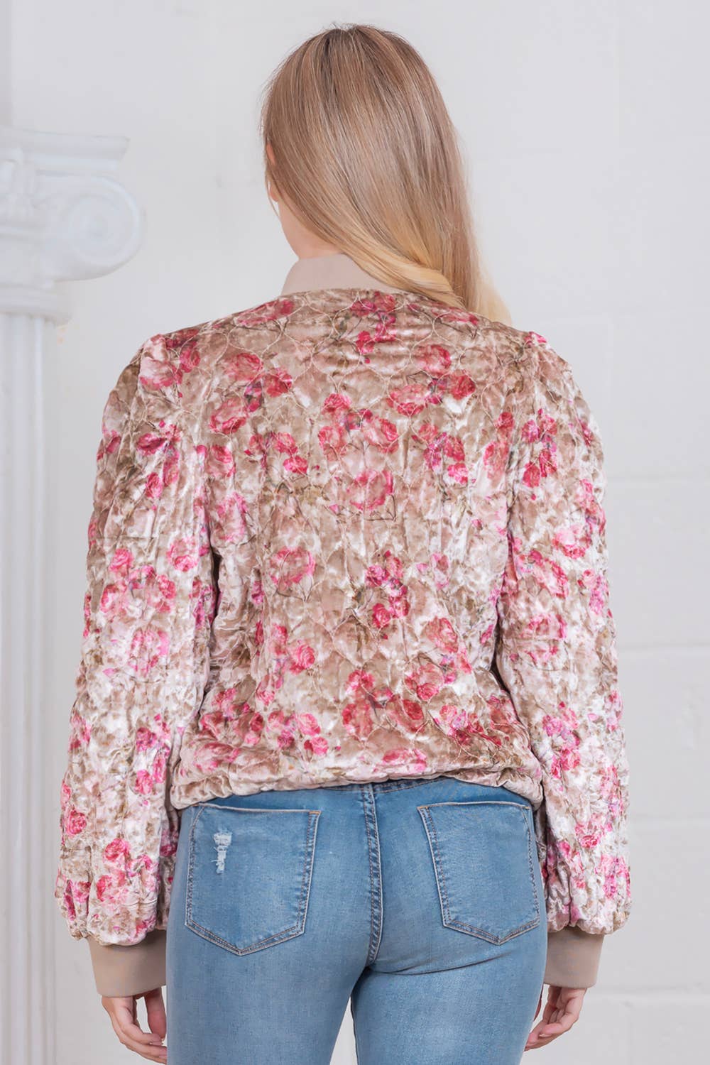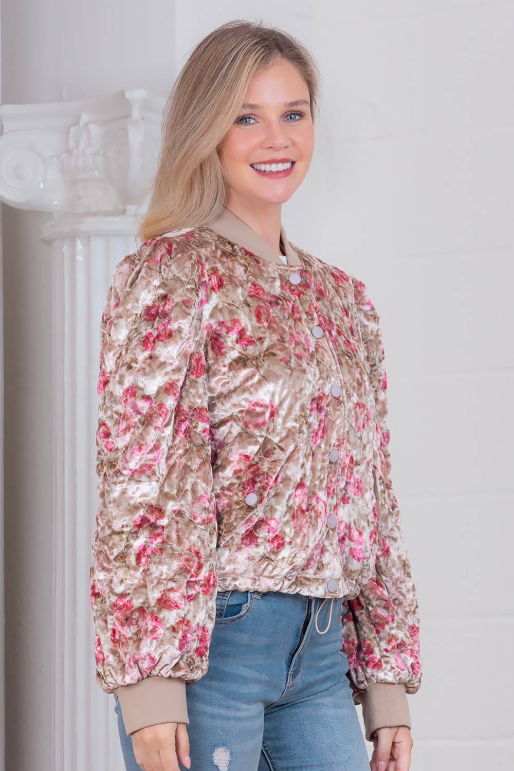 -Details: floral, long sleeve, velvet, snap buttons, bomber jacket