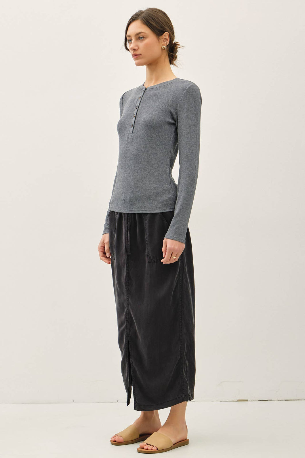 Slip into pure comfort with this henley that's basically a hug in fabric form. Crafted from buttery-soft modal with just the right amount of stretch, it hugs your curves in all the right ways while keeping things casual and cool. The classic ribbed henley neckline adds that timeless touch, while the slim fit keeps your silhouette sleek without sacrificing movement. Perfect for layering or going solo, this long-sleeve essential is your new go-to for effortless everyday style that feels as good as it looks.