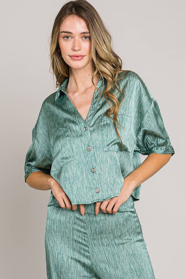 Green Short sleeve button down crop satin shirt