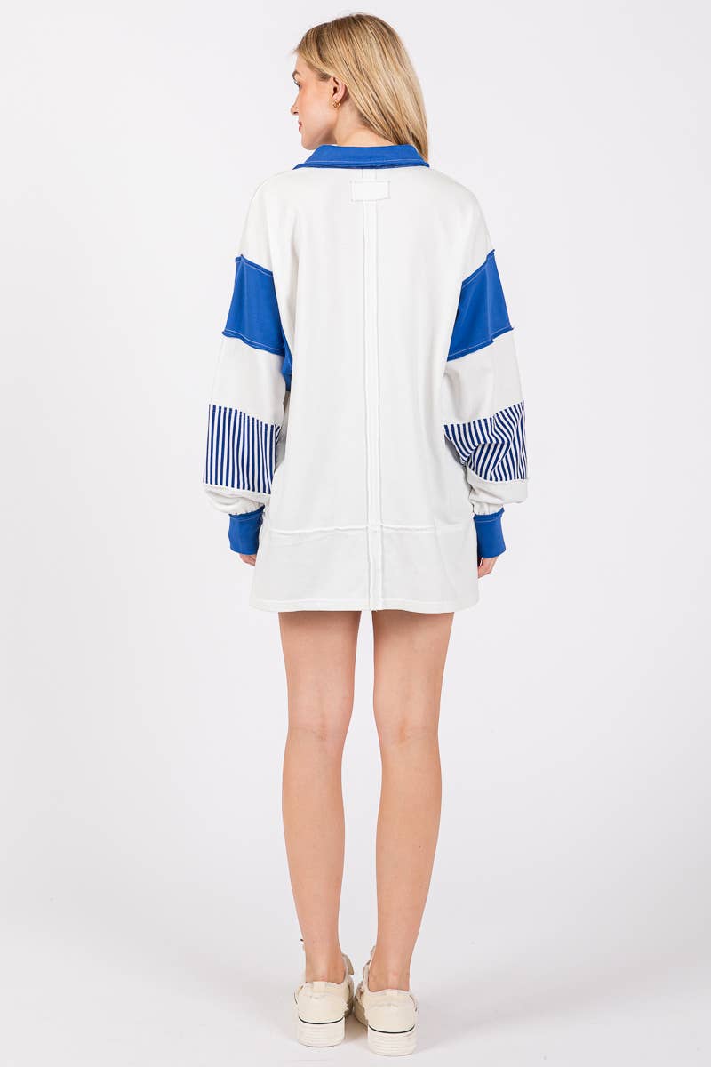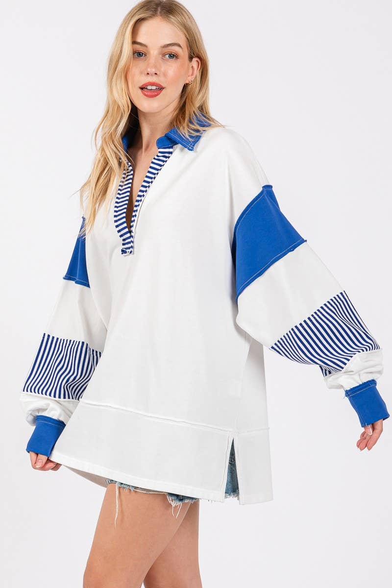 Bring sporty charm to your game day lineup with this Varsity Stripe Game Day Pullover. Featuring bold blue and white contrast panels with preppy striped accents on the collar and cuffs, this oversized piece blends collegiate style with casual comfort. The deep split neckline and drop shoulders give it a relaxed, effortless vibe-perfect for cheering from the bleachers or watching from home. Pair it with denim shorts or leggings for a winning gameday look!