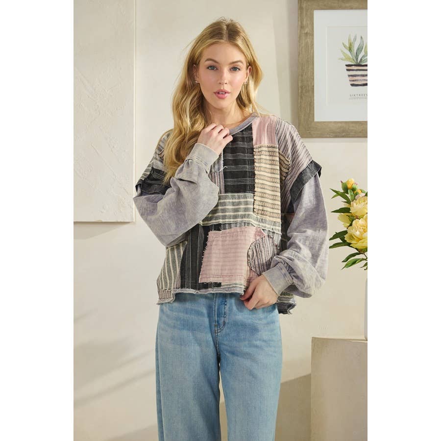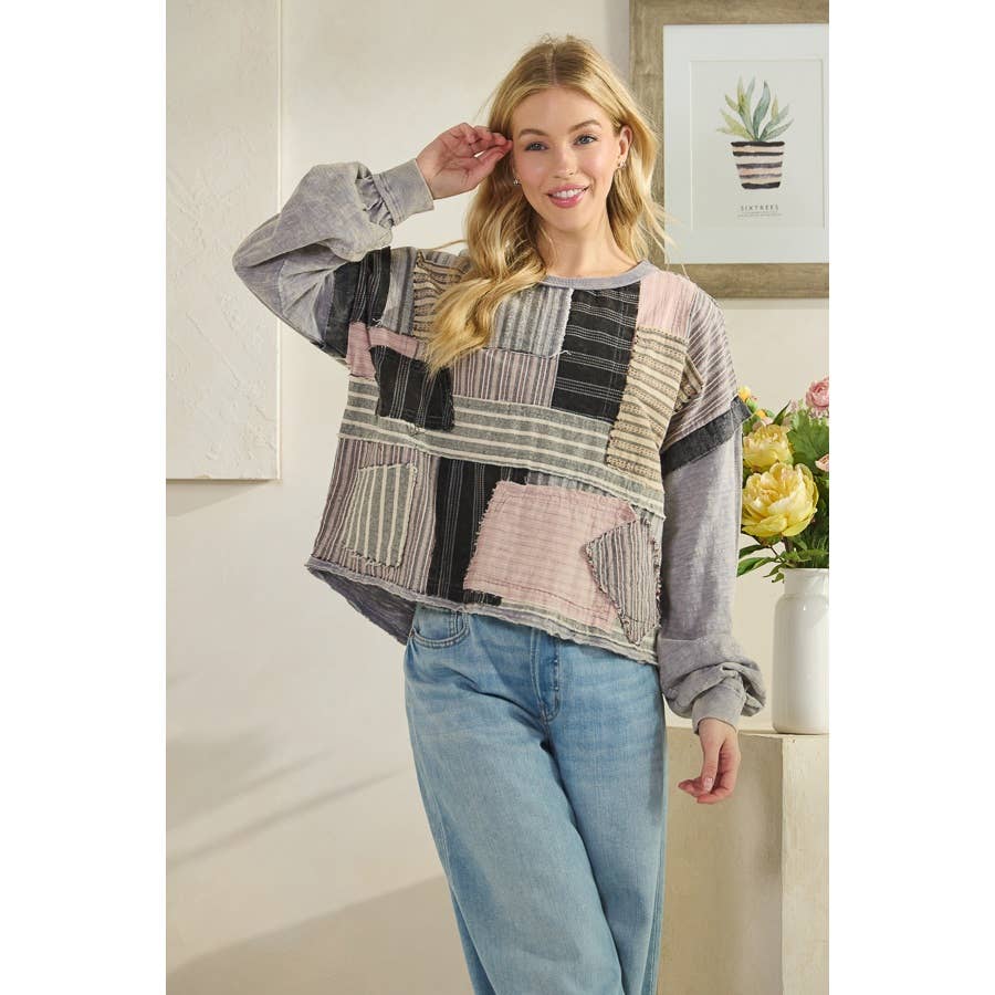 Dolphin Washed Patchwork Fabric Mixed Long Sleeve Oli+Hali Top