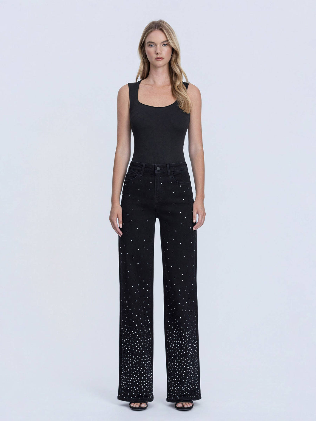 Elevate your denim game with these stunning Black High Rise Rhinestone Embellished Wide Leg Jeans! Crafted with comfort stretch fabric, these beauties feature a flattering high-rise waist, five functional pockets, and eye-catching rhinestone embellishments across the front. The wide-leg silhouette and finished hem create an effortlessly chic look that works for any occasion. With a 10½" rise and 33¼" inseam, they're designed to turn heads. Note: This hand-finished piece requires special care, as delicate embellishments may shift with wear. Embrace the sparkle and rock these show-stopping jeans with confidence!