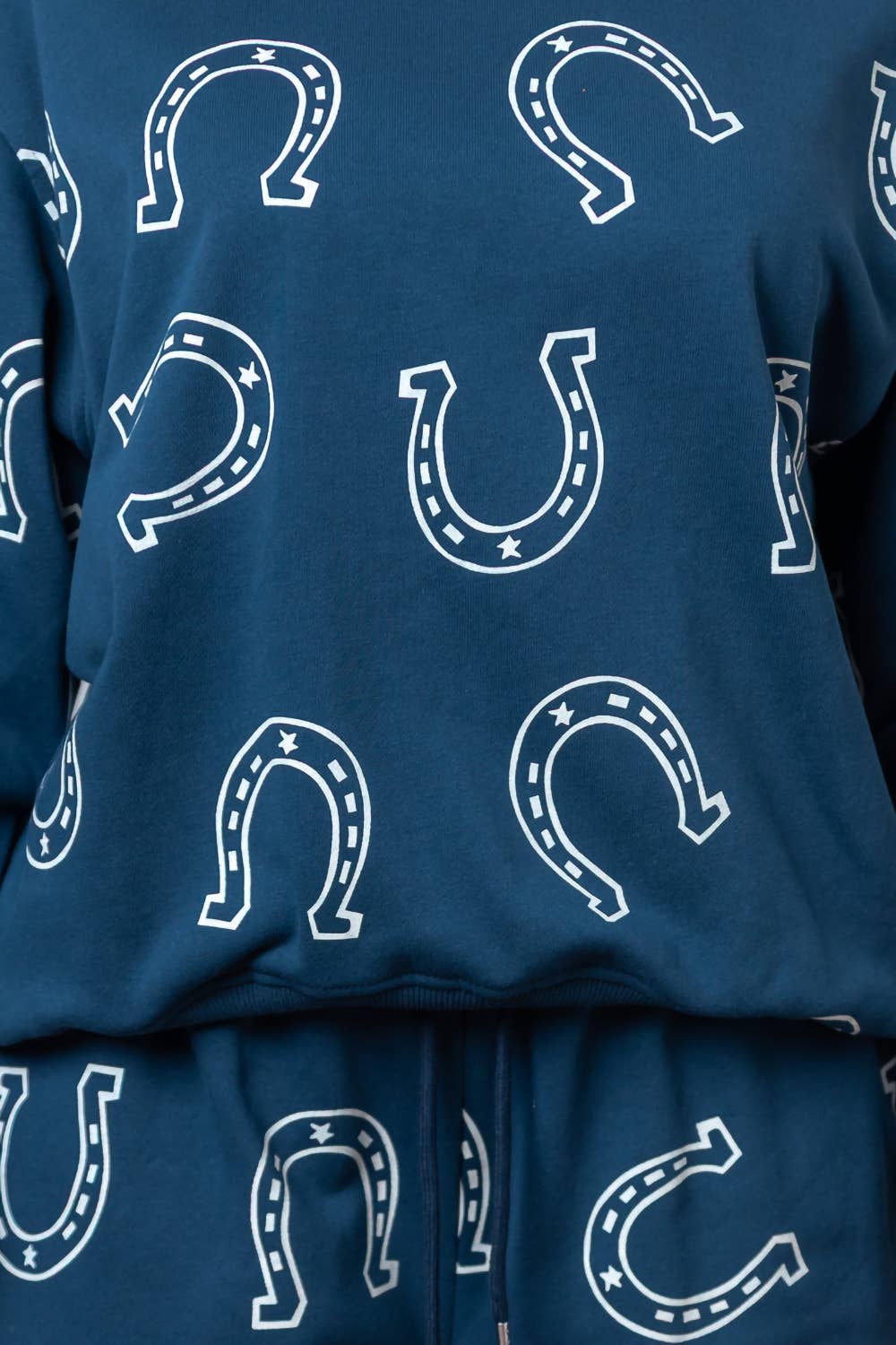 Saddle up in style with this Navy Round Neck Horseshoe Sweatshirt—your new go-to for cozy vibes with a touch of Western charm. Featuring a bold horseshoe print across the chest, this soft sweatshirt pairs long sleeves with a classic round neckline for effortless comfort. The relaxed fit drapes beautifully without clinging, making it perfect for lazy days, casual outings, or whenever you need that perfect blend of comfort and personality. Whether you're channeling your inner cowgirl or just love a good graphic tee vibe, this navy beauty delivers softness you'll want to live in. Toss it on with your favorite jeans and you're ready to wrangle the day.