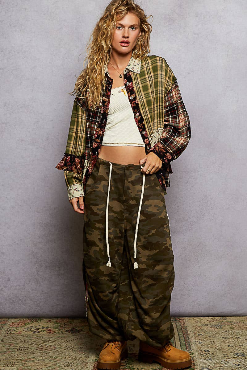 Designed in long sleeve roomy fit shirt in plaid woven with varied plaid patchwork, ruffle detailing, and accented with novelty button closure.