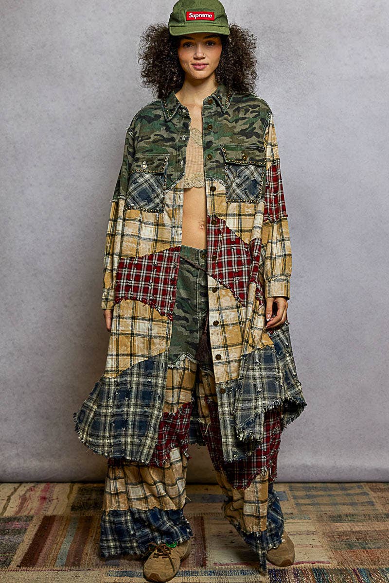 Camo Multi Long Sleeve Plaid Woven Varied Patchwork Maxi POL Shirt Jacket