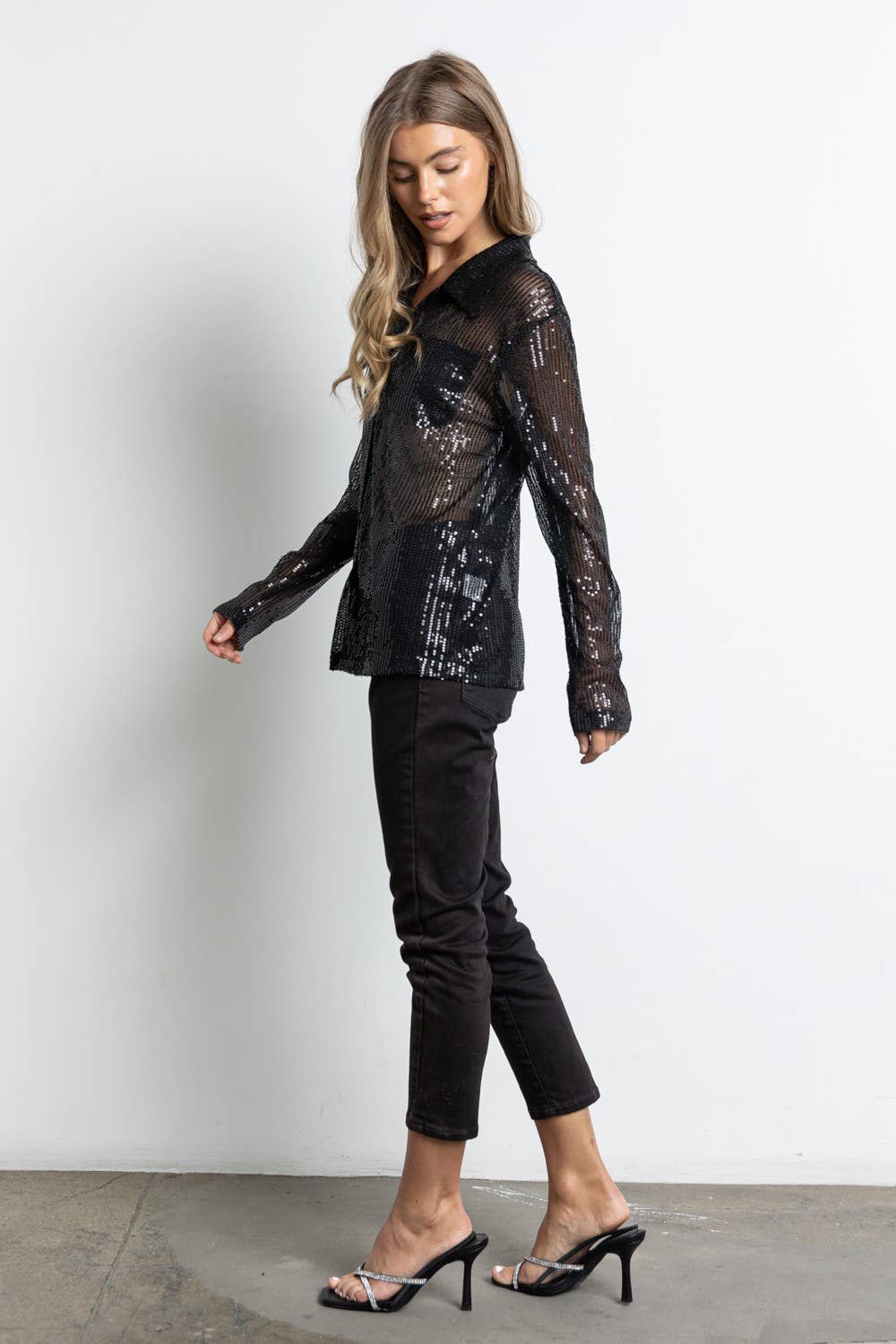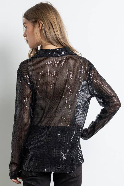 Shine bright in this show-stopping sequined button-down blouse! Crafted from semi-sheer mesh fabric, it's the perfect blend of glam and wearability. Long sleeves and a single chest pocket keep things practical, while thousands of shimmering sequins steal the spotlight. Whether you're heading to a night out or elevating your everyday look, this statement piece delivers sparkle without the fuss. Model wears size Small at 5'8" with 32-24-34 measurements.